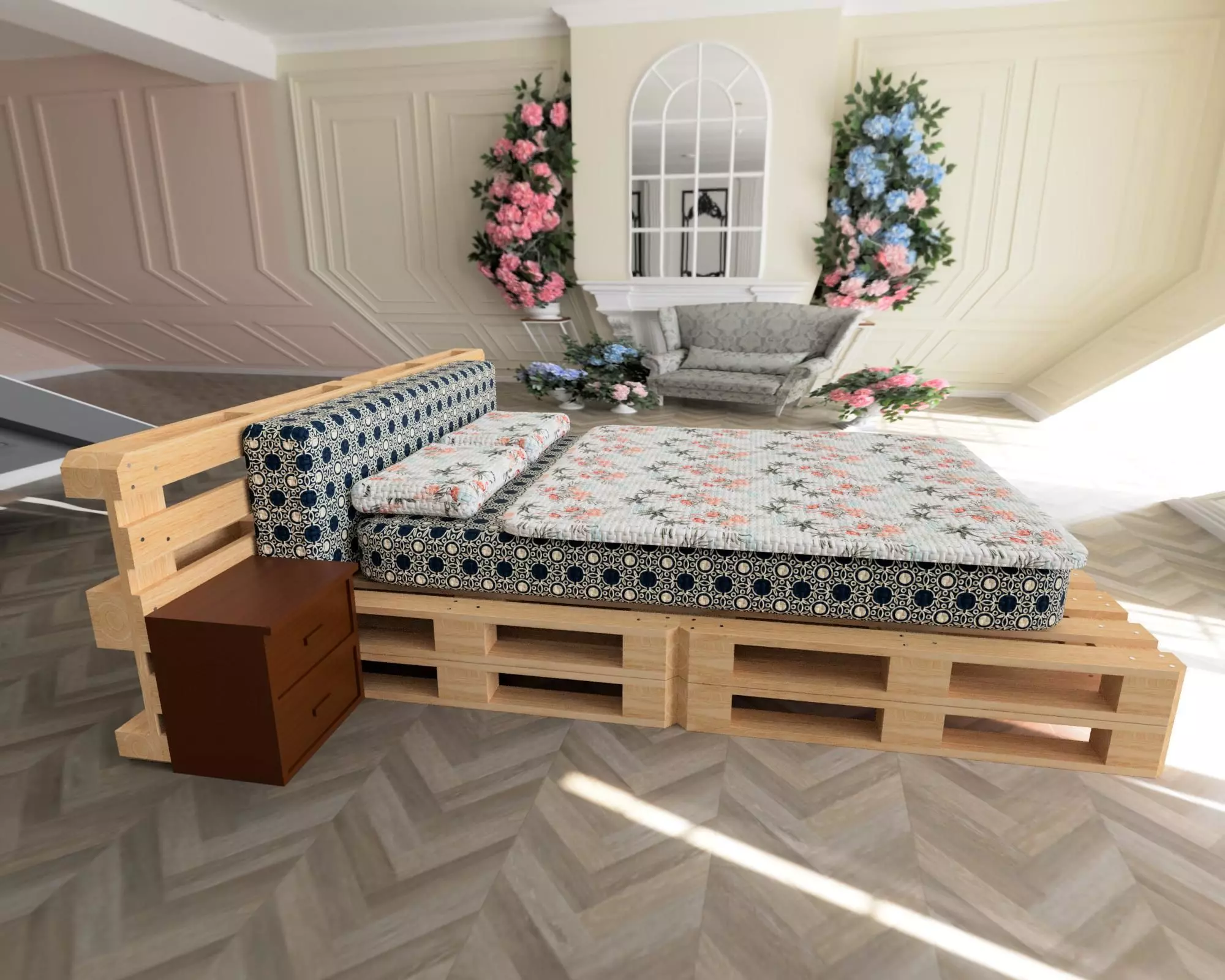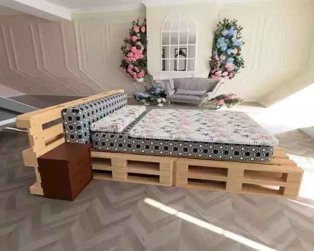 It is a bed with pallets. This is furniture for home. This model is perfect for original decoration in house. It can be use for a room. The model is divided with 10 pallets to create the structure, a mattress, 2 pillows, a blanket, and 2 furnitures on each sides of the bed. This model has been created with Fusion 360. Clean geometry. Real rendering with wood material for pallets, wood material for furnitures, and different fabric material for mattress, pillows and blanket. Model resolutions are optimized with polygons. It is possible to edit the model or to change materials.