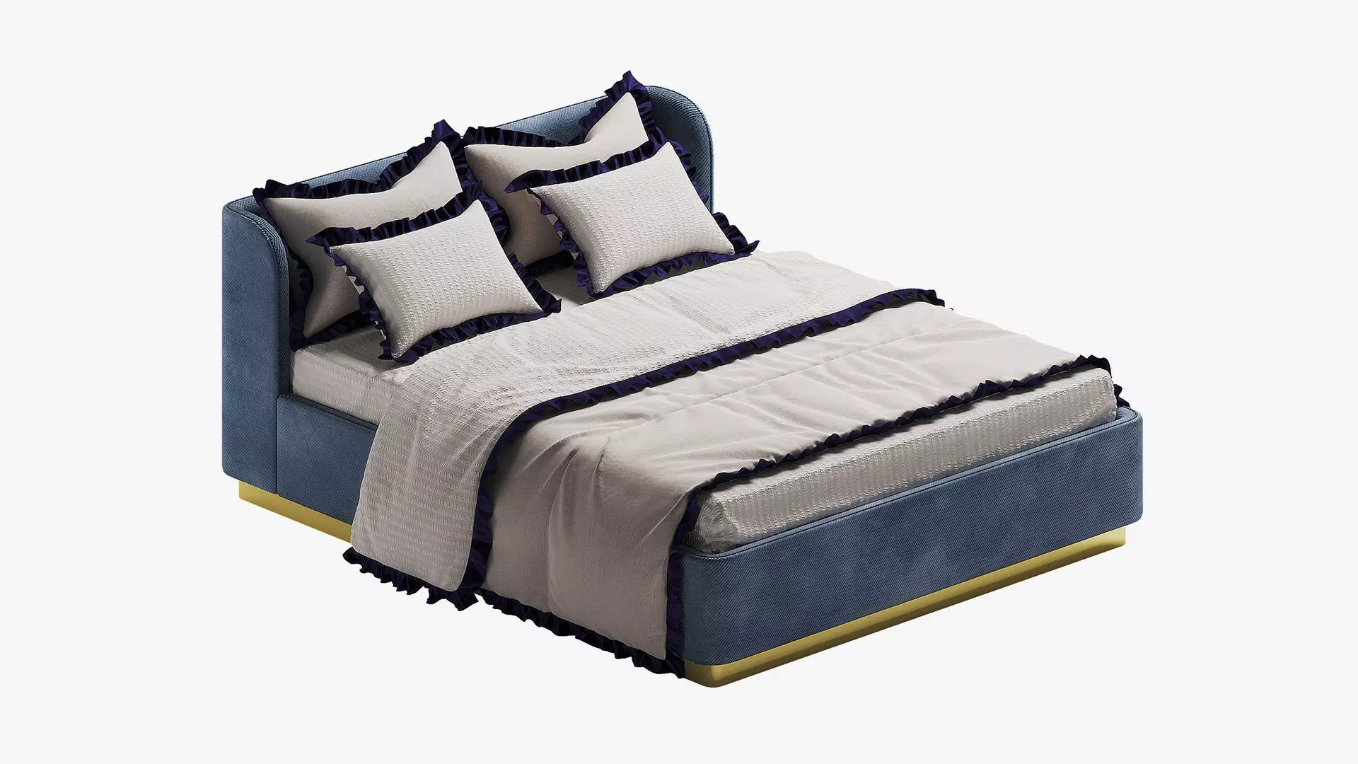 The bed is in blue fabric with a base in matte gold material. The bed linen is made of grey pressed cotton stripe, combined with light grey bedding. Contrasting dark blue ruffles add a decorative effect.