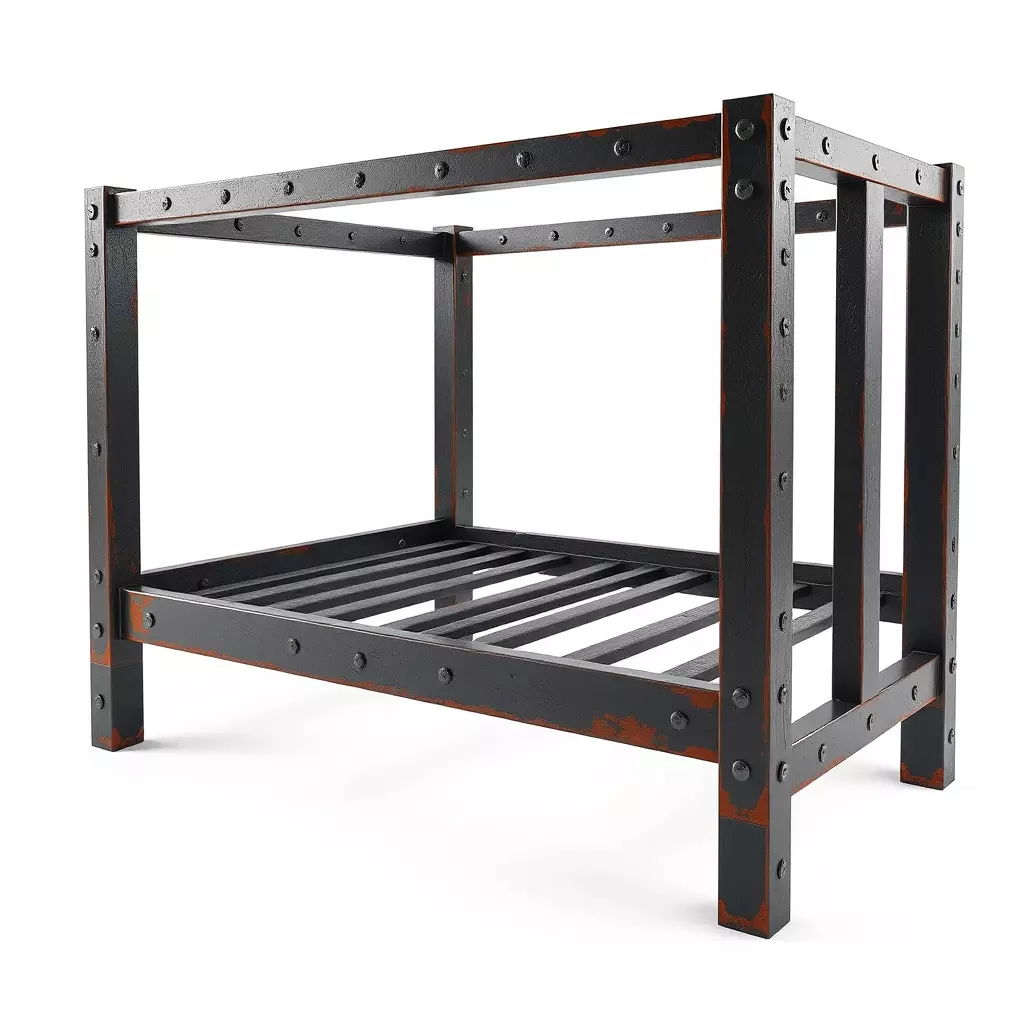 This highly detailed 3D model represents an industrial-style metal bed frame, featuring a robust, weathered design complete with a canopy structure. The model is meticulously crafted with a distressed black paint finish that reveals rusty undertones, giving it an authentic, aged appearance perfect for adding character to any scene. Visible bolts and sturdy metal beams enhance its rugged aesthetic. This asset is ideal for a wide range of applications, including game development, where it can serve as an immersive prop in post-apocalyptic, horror, or industrial-themed environments. It is also perfectly suited for architectural visualization projects, particularly for loft apartments, rustic interiors, or modern industrial spaces, providing a strong focal point. Digital artists and animators will find this model valuable for creating realistic renders and cinematic sequences. Its clean topology and efficient polycount make it suitable for real-time applications such as augmented reality (AR) and virtual reality (VR) experiences, ensuring smooth performance. The model comes fully UV unwrapped with high-quality PBR (Physically Based Rendering) textures, guaranteeing realistic material representation under various lighting conditions. It is ready for direct integration into your projects. Supported file formats include GLB, OBJ, STL, ABC, DAE, FBX, USD, and PLY, ensuring broad compatibility across different 3D software and engines. Whether for static renderings or dynamic interactive scenes, this model delivers both visual appeal and technical efficiency.