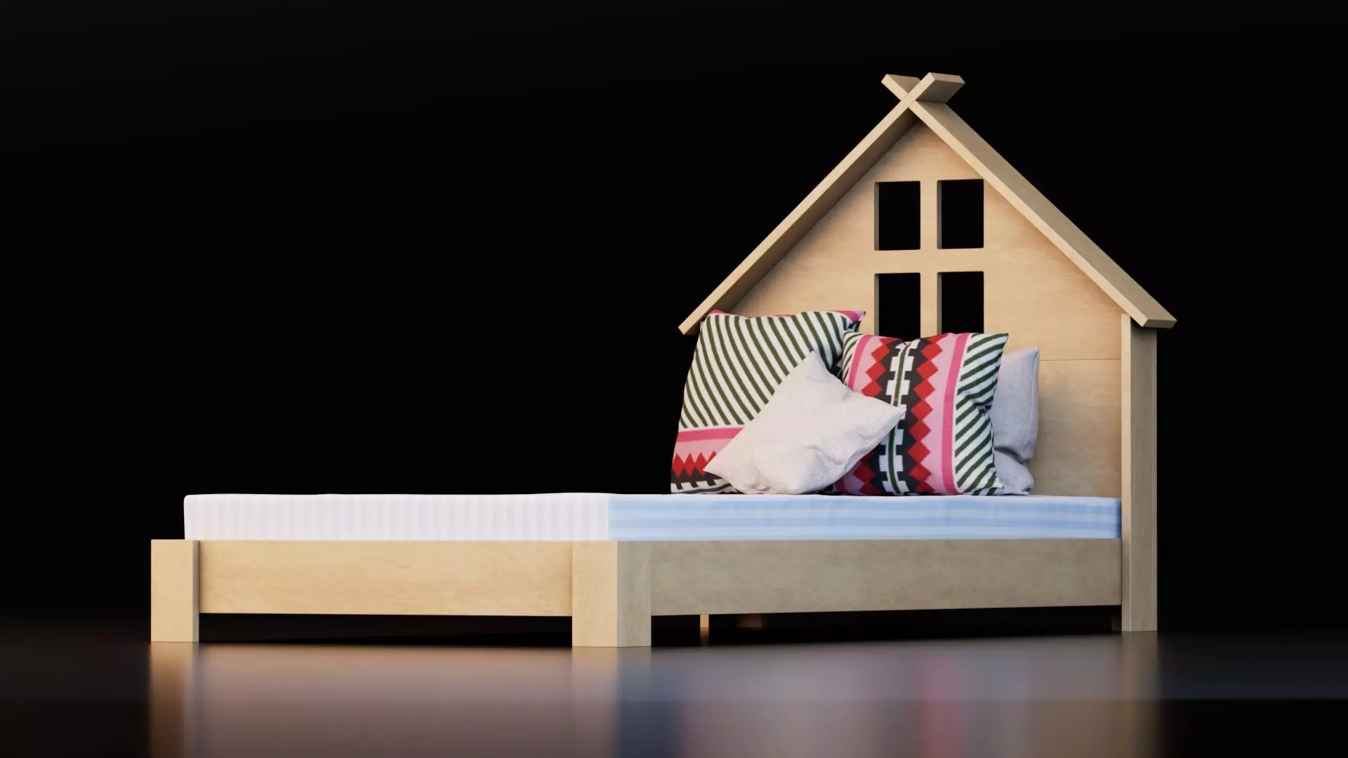Stylized kids bed with house-shaped headboard