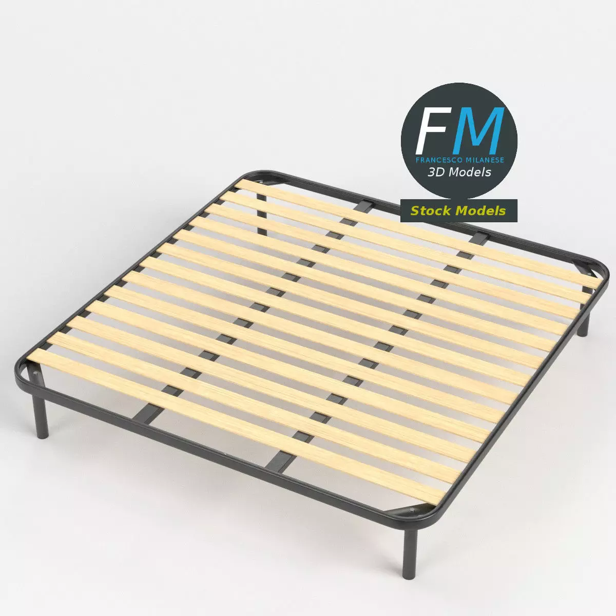 King size bed frame with small slats 3D Model. Production-ready 3D Model, with PBR materials, textures, non overlapping UV Layout map provided in the package.Quads only geometries (no tris/ngons).Easily customizable: UV unwrapped geometries; UV Layout maps provided in the package as png with alpha images.Each Object, Material or Texture provided in the package has a unique, meaningful name.Made in Blender 3.3 with Cycles Principled BSDF PBR shader with textures included (Eevee compatible), then exported to OBJ and FBX (with embedded PBR Textures); materials and textures made in Substance Painter, exported for PBR, Cycles, V-Ray, Unity, Unreal.PROMO IMAGES: the first image has been rendered in Cycles for Blender; in particular, you can find 11+ promo images in this description: