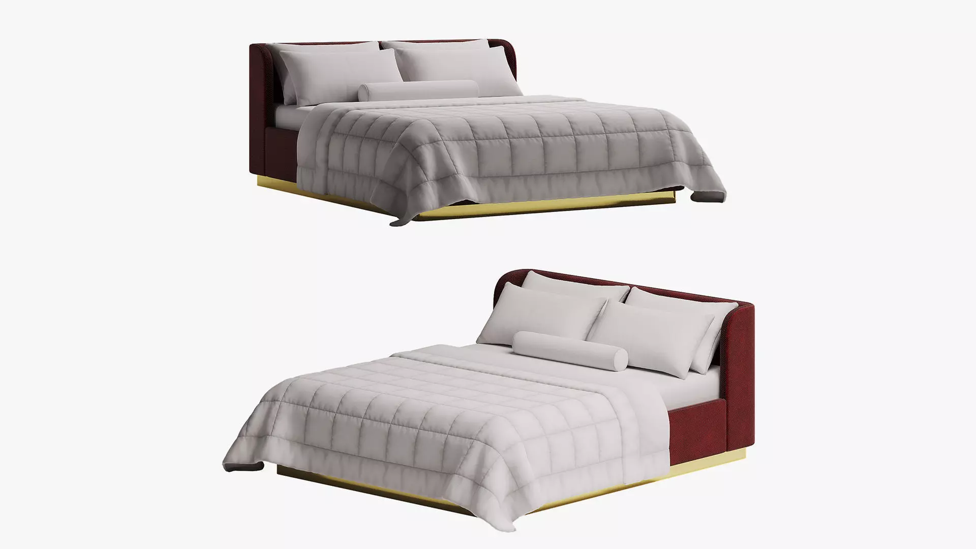 The archive contains a scene of a bed with low-poly bedding. A red upholstered bed with a padded headboard. Golden base. Two pairs of pillows. Cylindrical decorative cushion. A mattress, a quilt hanging from three sides. It is an ideal option for long-range plans, schematic and planned images, and importing into other programs.