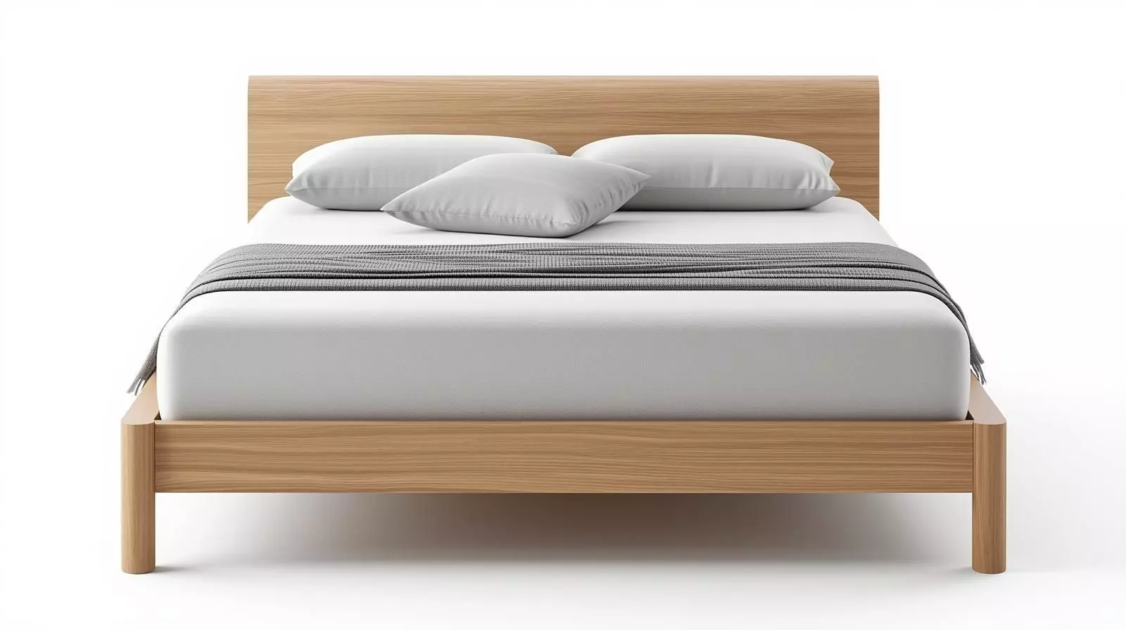 The bed is impeccably dressed with crisp white sheets, plush grey pillows, and a casually draped textured grey throw blanket, inviting ultimate relaxation. This high-quality model is perfect for architectural visualizations, interior design renderings, furniture catalogs, or any scene requiring a realistic, stylish, and uncluttered bedroom centerpiece.