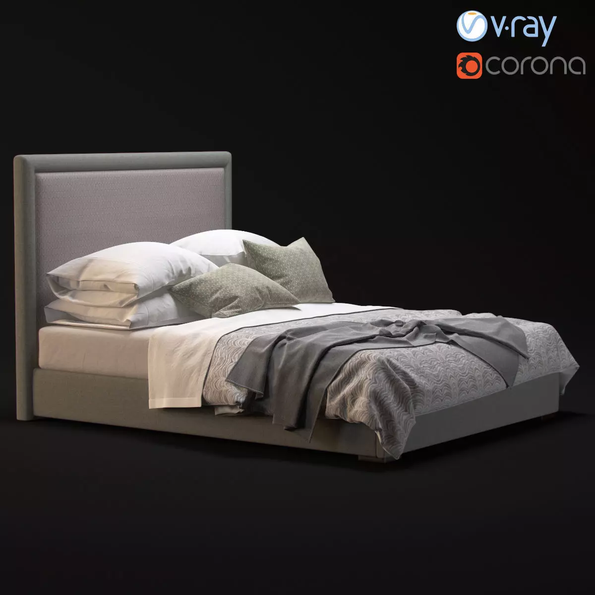 H62F series modern complete bed set modeled in 3dsMax 2013 with both V-Ray and Corona files included.