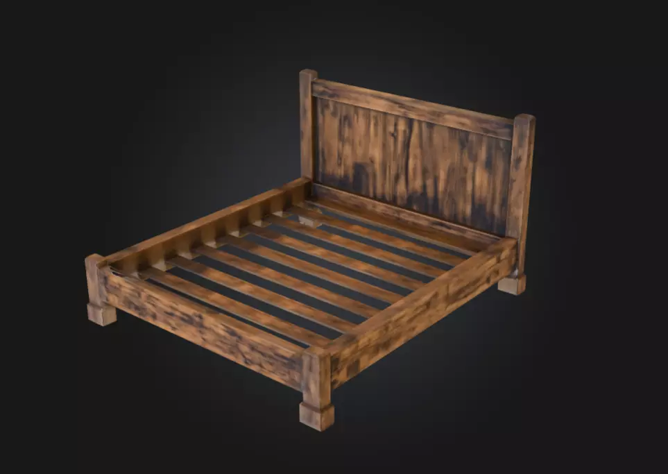 The surface treatment showcases worn timber textures, with darker stains, subtle scratches, and uneven coloration that suggest age, exposure, and repeated use. These details give the bed a lived-in quality, implying stories of travelers resting after long journeys, villagers sleeping after days of hard labor, or survivors finding shelter in a harsh world. The wood finish reacts naturally to lighting, producing warm highlights and soft shadows that enhance realism in both stylized and semi-realistic projects.
