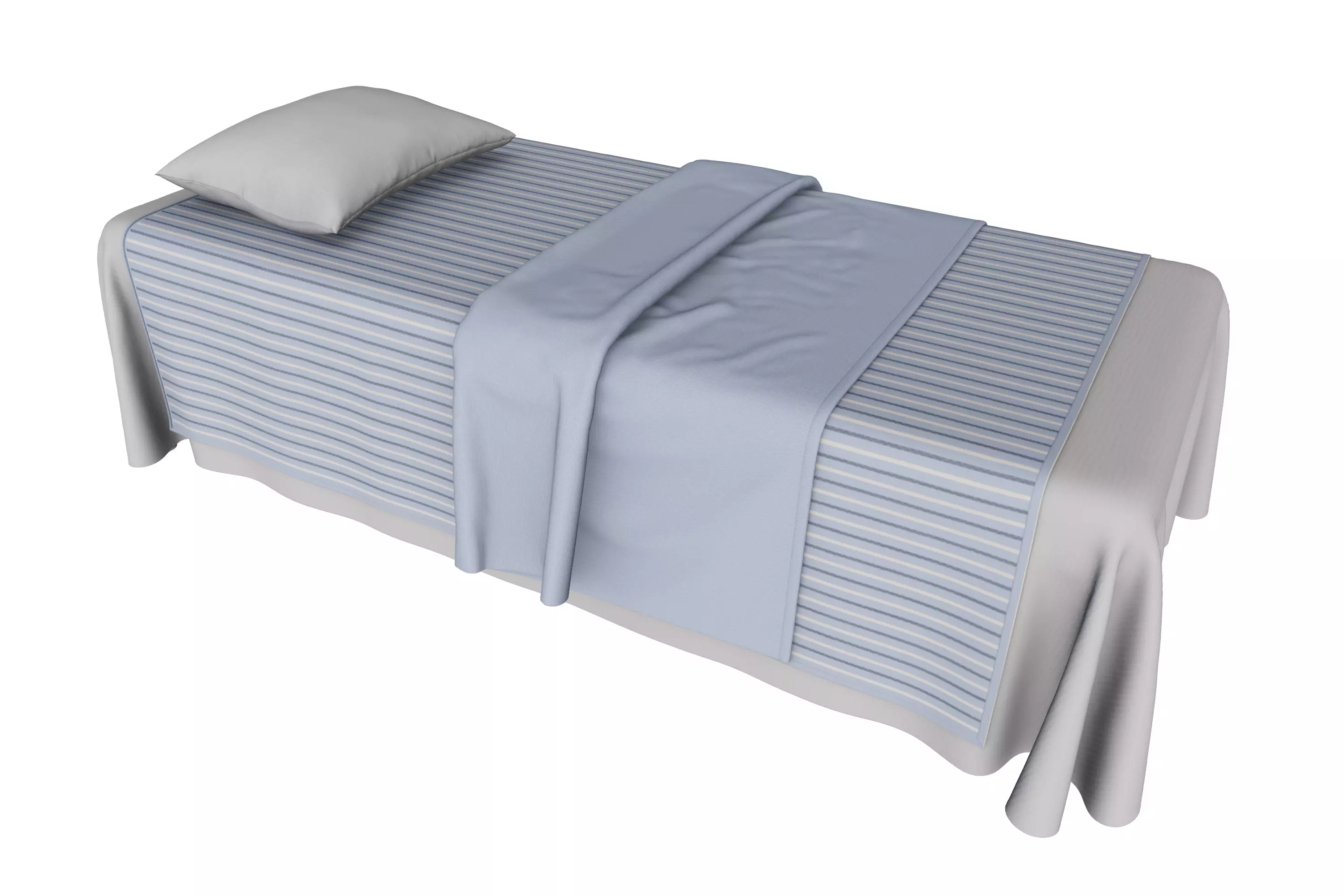 The bedding arrangement includes a striped blanket or runner in shades of blue, grey, and white, lying across the length of the bed. This is topped with a solid light-blue throw blanket folded neatly across the middle, adding a layer of texture and comfort. A simple, light-grey pillow is placed at the head of the bed.