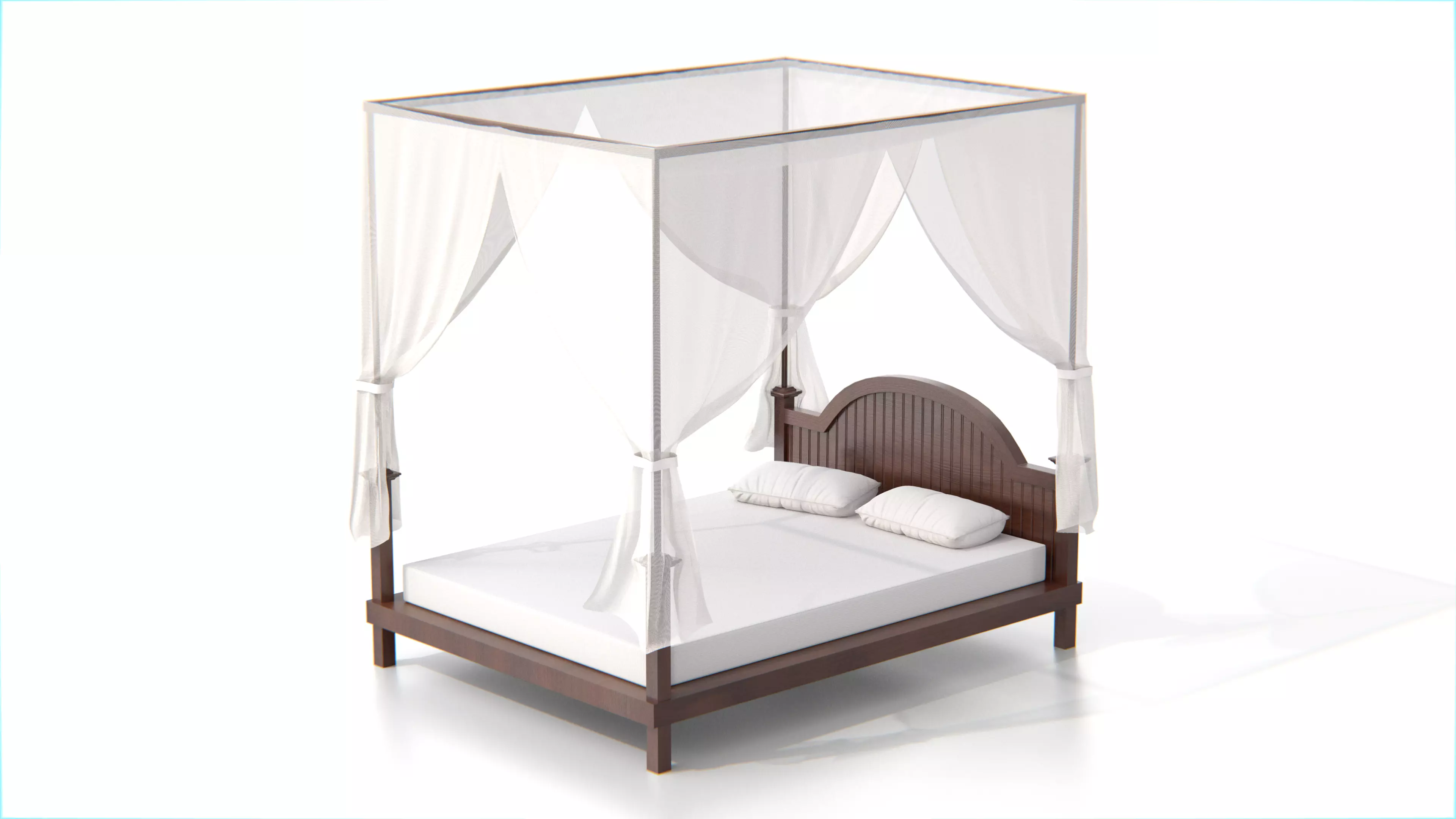 This elegant wooden canopy bed features a gently arched headboard with vertical panel detailing and a full canopy frame draped in sheer white curtains. The lightweight fabric adds softness and romantic ambiance while remaining breathable and airy. The sturdy wooden structure includes a smooth mattress base and two soft pillows for added realism.Perfect for bedroom scenes, luxury interiors, or resort-style visualizations, this model brings a timeless charm to both classic and modern design renders.