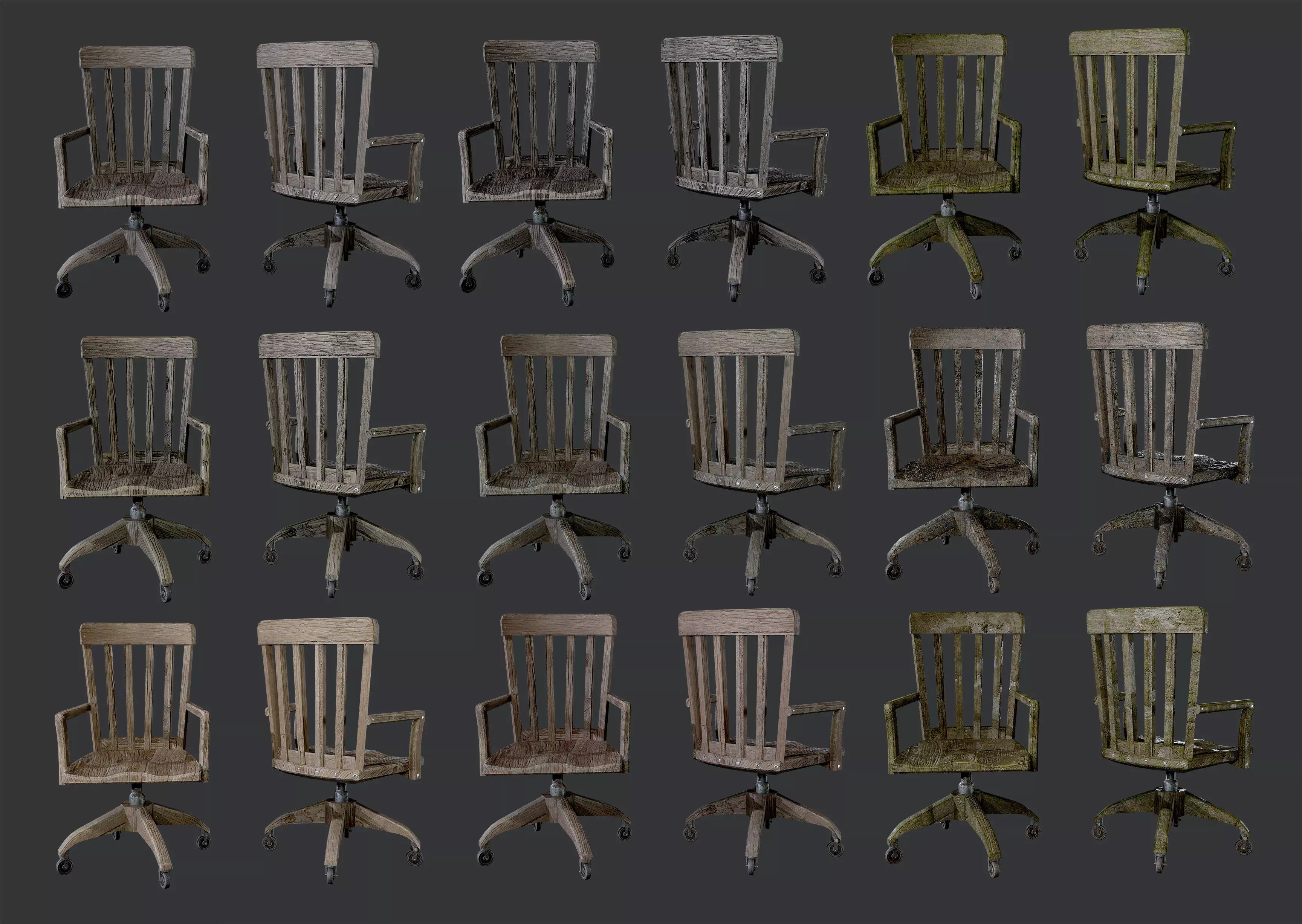 10 Low poly models of an antique desk chair, unwrapped with PBR textures. OBJ files, 3DS and FBX files. This pack contains 10 model options. Ready for use in any 3D software or game engine.
