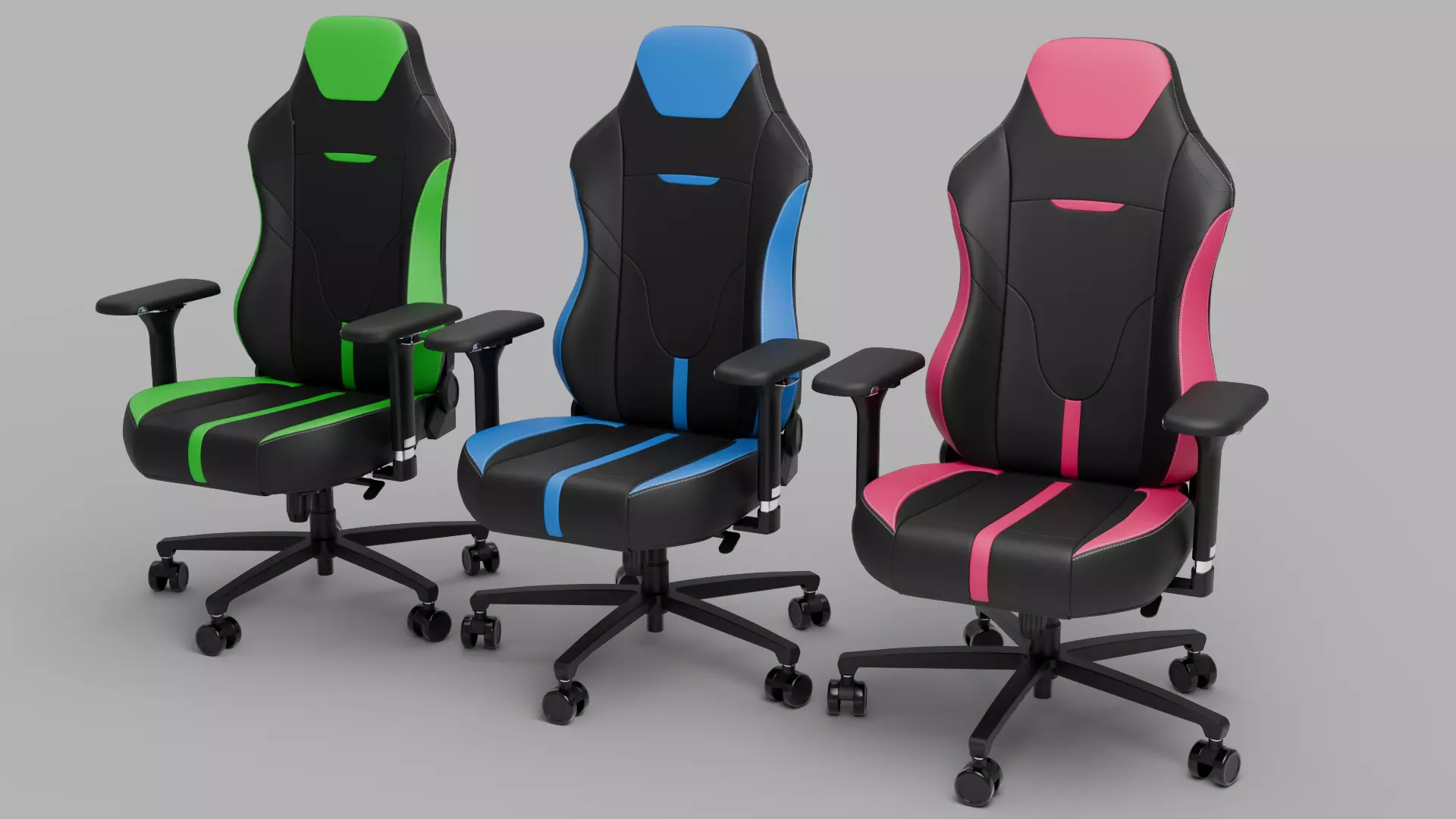 This 3D model set presents a collection of three ergonomic gaming chairs in vibrant colours: green, blue, and pink accents on a black base. Each chair is designed with a sleek, modern aesthetic, featuring detailed stitching and contours to highlight its comfortable yet sporty design. Made with a leather-like material for the outer surface and optimized for photorealistic rendering, these models are ideal for product visualization, interior design, or gaming-themed projects. Available in formats compatible with popular platforms, each model offers clean topology, high-quality textures, and PBR materials to enhance realism in various lighting setups.