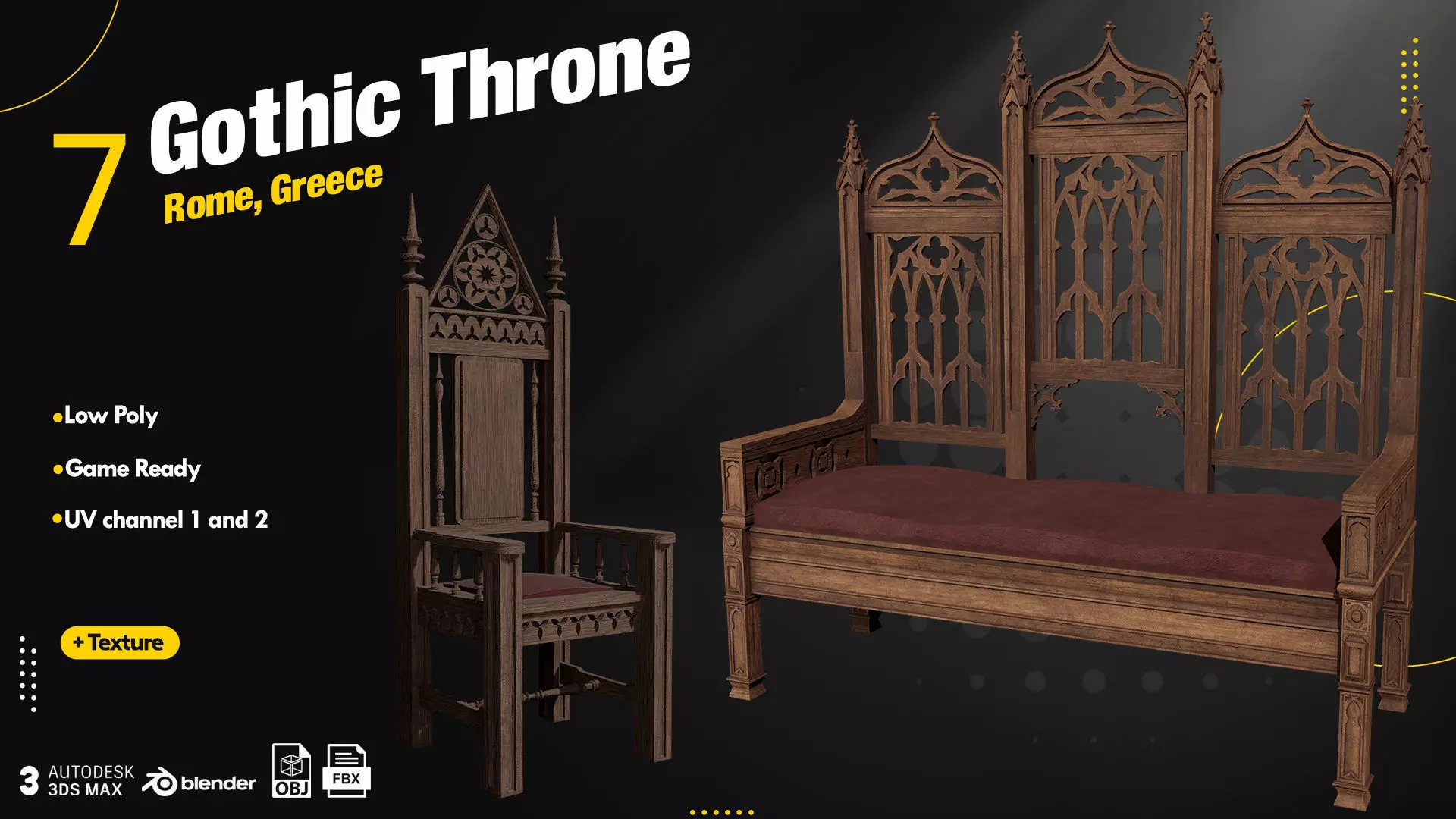 A majestic wooden throne featuring intricate Gothic carvings and a plush cushion, optimized for both performance and visual appeal. Enhance your scene with this striking Gothic centerpiece!