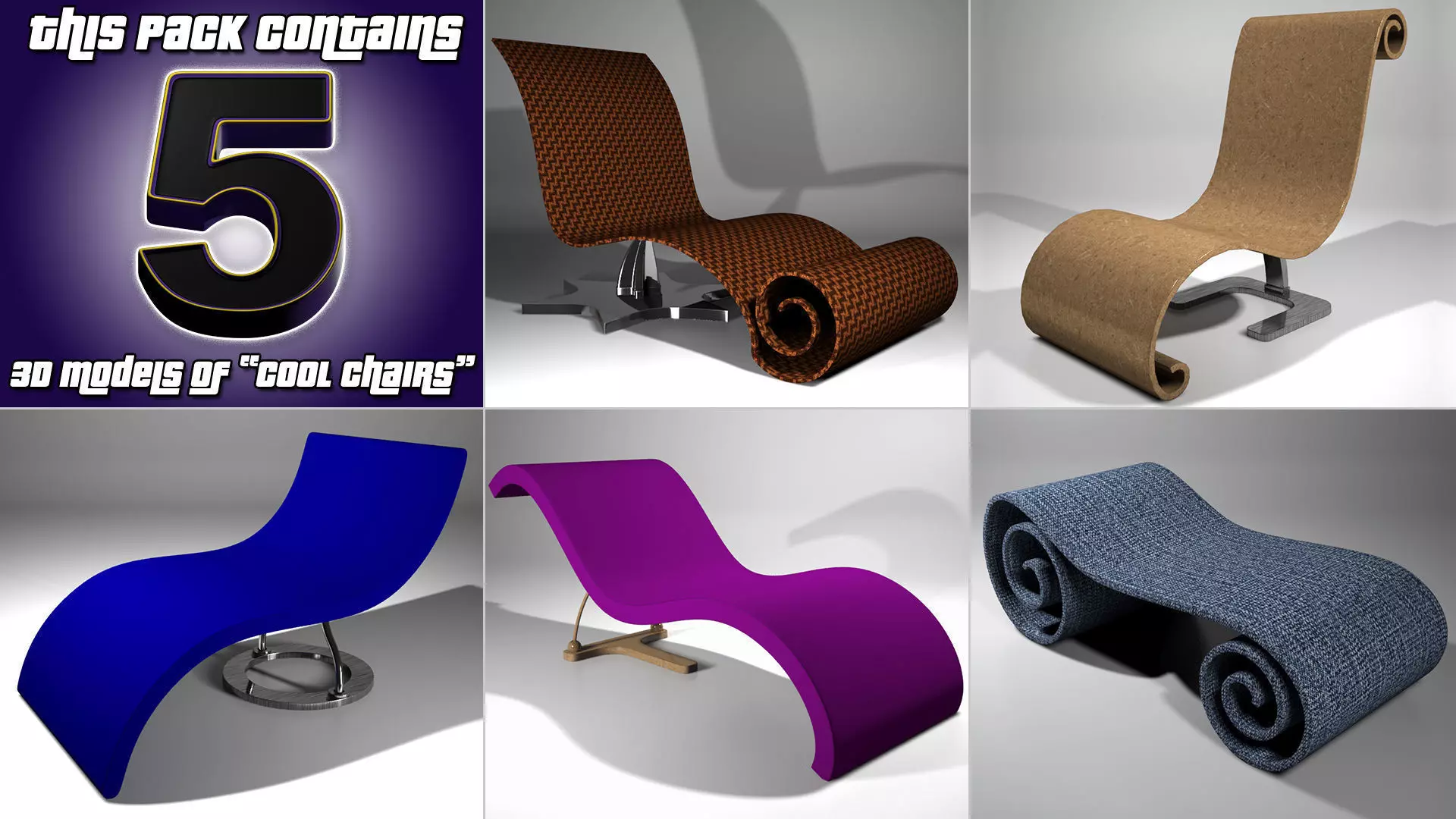 This package contains a collection of 5 3D Models of Cool Chairs.