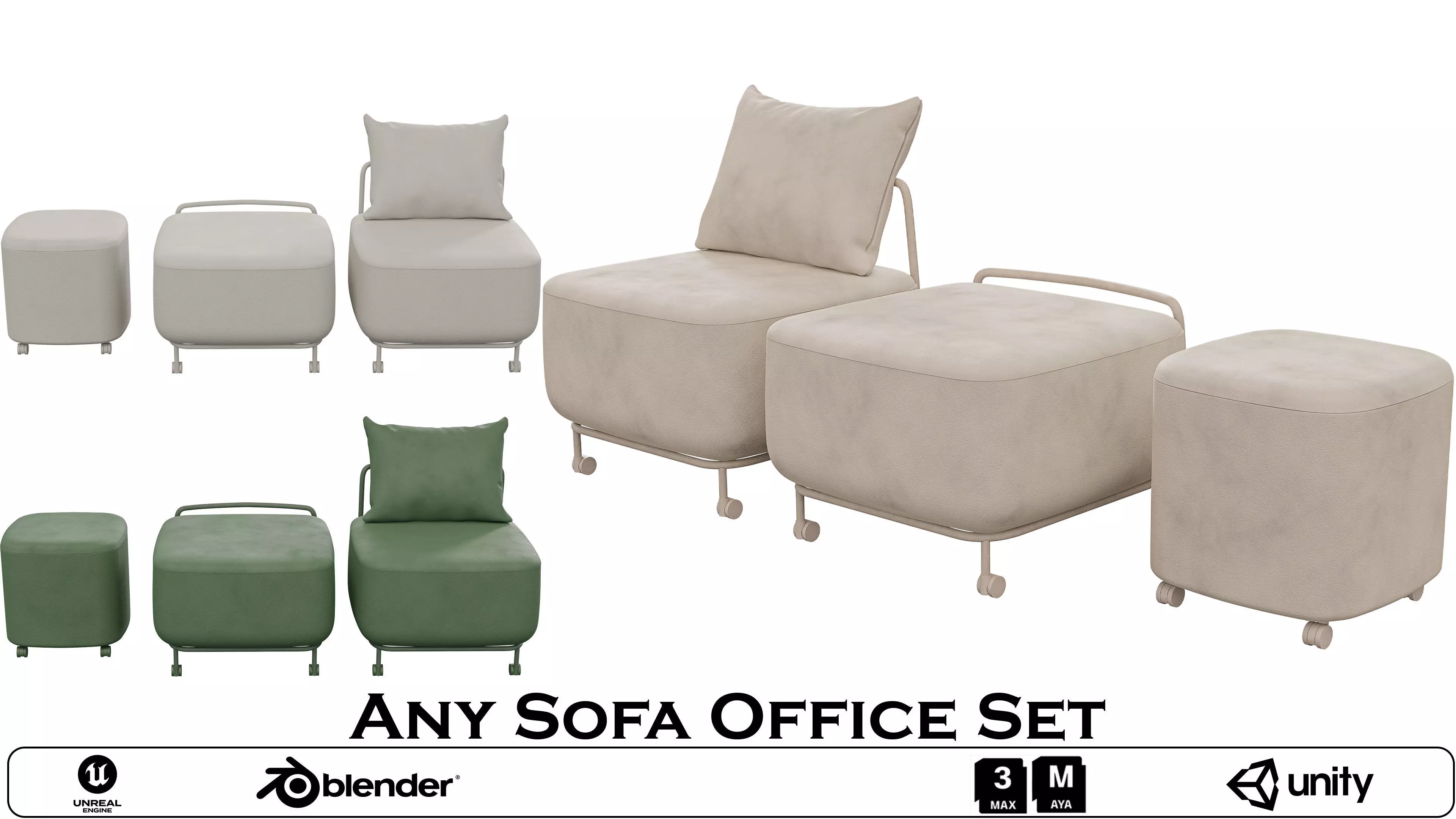 Name: Any Sofa Office Set – Modular Seating SystemType: modelFormat: 3Ds Max 2013Export: FBX, OBJRender: VRay (5.x), Corona (9)Polys: 47004Verts: 47957Matclasses: Multimaterial,VRayMtl,_CoronaPhysicalMtlUnits: CentimetersDimension: 229.2 x 68.99 x 81.56Date: 2025.10.11Design flexible and stylish office environments with the Any Sofa Office Set, a modular 3D furniture collection crafted for adaptability and comfort. This set includes various seating configurations—ottomans, chairs with backrests, and armrests—available in two elegant color schemes: beige and green. Each piece features clean lines, soft cushioning, and a minimalist aesthetic, ideal for modern workspaces, lounges, or collaborative zones.