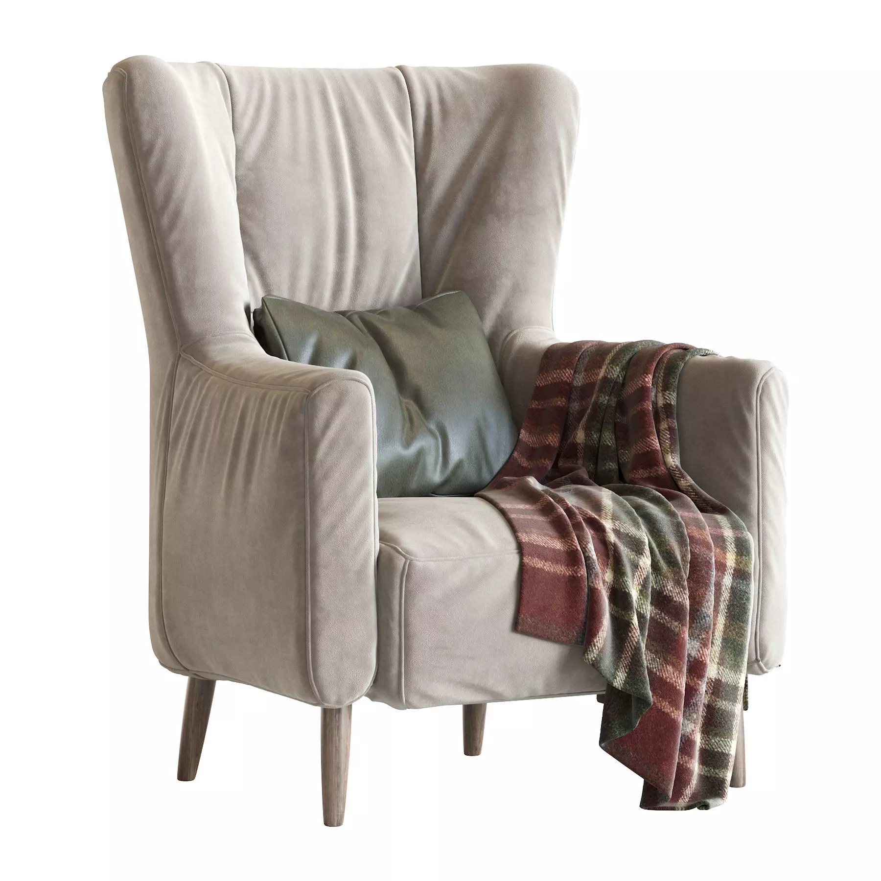 One of the basic pieces of furniture, a chair is a type of seat. Its primary features are two pieces of a durable material, attached as back and seat to one another at a 90°-or-slightly-greater angle, with usually the four corners of the horizontal seat attached in turn to four legs—or other parts of the seat's underside attached to three legs or to a shaft about which a four-arm turnstile on rollers can turn—strong enough to support the weight of a person who sits on the seat (usually wide and broad enough to hold the lower body from the buttocks almost to the knees) and leans against the vertical back (usually high and wide enough to support the back to the shoulder blades). The legs are typically high enough for the seated person's thighs and knees to form a 90°-or-lesser angle.[1][2] Used in a number of rooms in homes (e.g. in living rooms, dining rooms, and dens), in schools and offices (with desks), and in various other workplaces, chairs may be made of wood, metal, or synthetic materials, and either the seat alone or the entire chair may be padded or upholstered in various colors and fabrics.