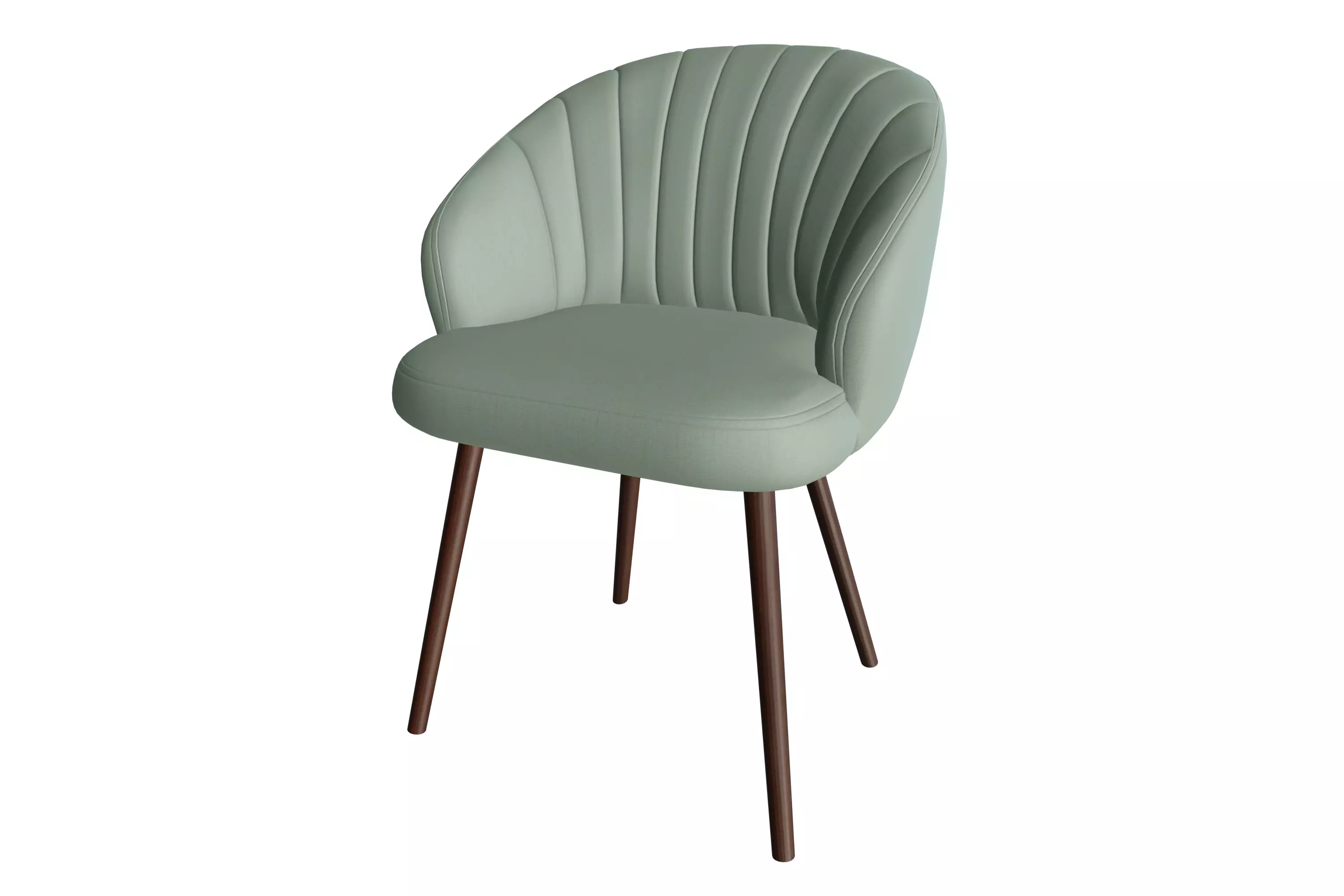 The chair features a comfortable, rounded seat and backrest, fully upholstered in a soft sage green or pale mint-colored fabric/velvet. The distinguishing feature is the backrest, which showcases a sophisticated vertical fluting or channeling, adding texture, visual interest, and ergonomic support.