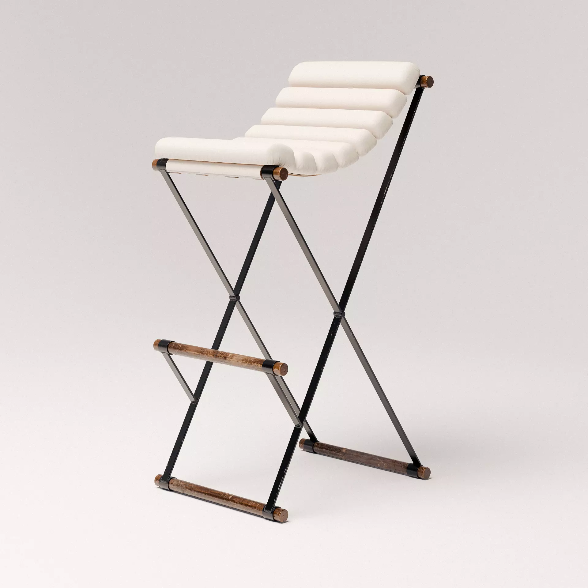 A minimalist and industrial design with sleek lines and a modern aesthetic. The stool has a thin, X-shaped metal frame, giving it a lightweight, airy appearance. The seat is padded with rounded cushions in a segmented, tube-like style, offering comfort while maintaining the stool's sleek profile.