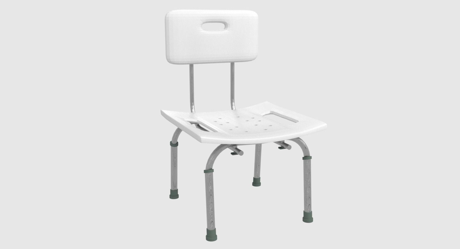 A plastic / aluminum bathroom chair that you might find in showers, medical environments, or home bathrooms.