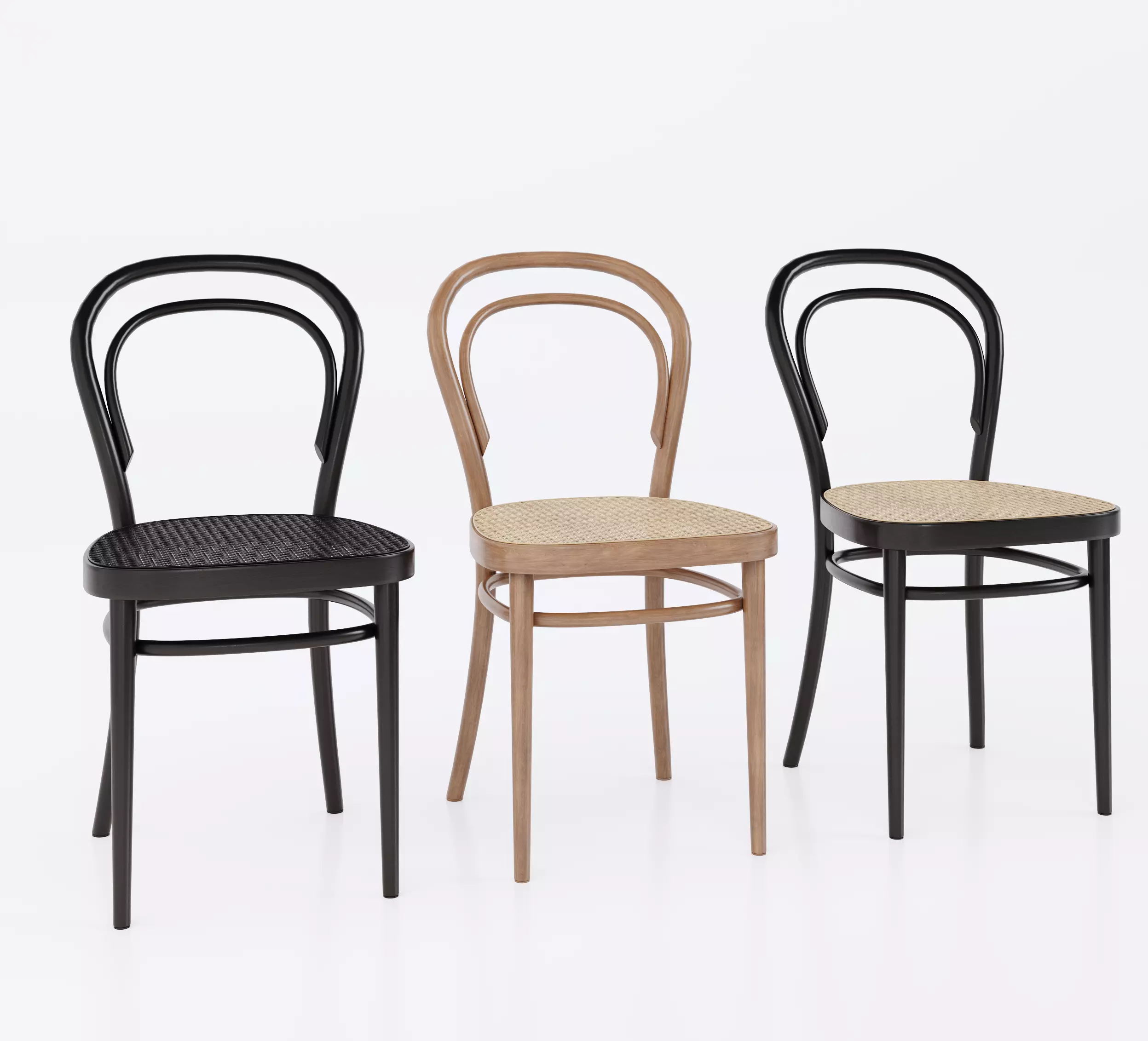 Elegant bentwood classic chair. The file includes 3 chairs finished in natural wood and black wood with seats made of wicker work.