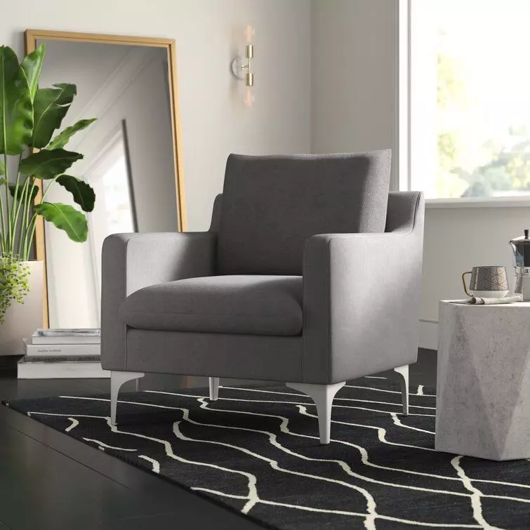 • Perfect for rounding out your ensemble with both a handy seat and a complimentary touch of style, accent chairs like this are a great option for rounding out any space. Crafted from a solid and manufactured wood frame, this armchair is wrapped in polyester upholstery for a padded touch while you sit. Square arms tapered legs lend this piece a clean-lined, modern look at home in a mid-century-inspired ensemble.