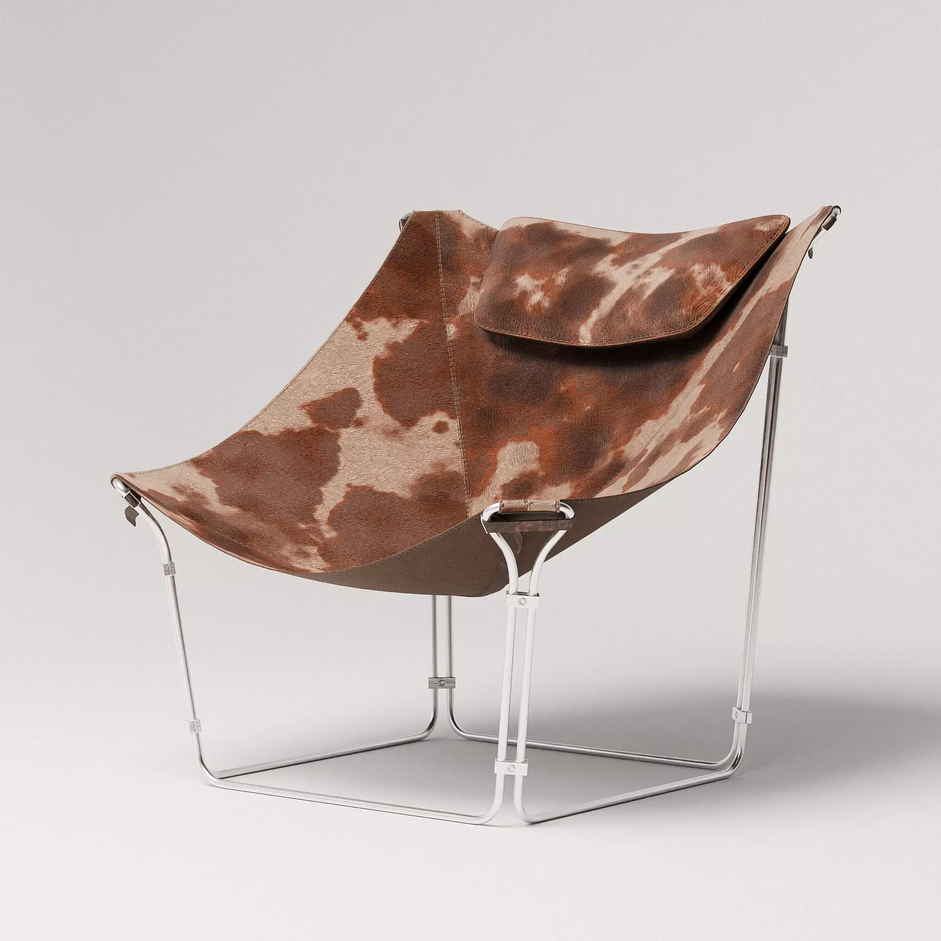 This extraordinary lounge chair by Kwok Hoi Chan is produced by Steiner, Paris. What marks this design is the frame made of tubular steel in which a natural cow hide is spanned into. The contrast between the natural animal based material and the industrial strictness of the steel characterizes this lounge chair.