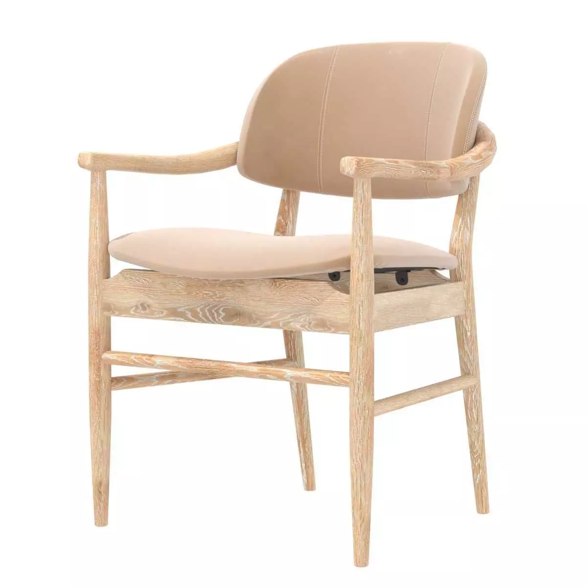 Mid-century vibes meet modern materials. Whitewashed oak frames float-like seating of top-grain leather in a versatile light tan, with sloped arms and cone-tapered legs adding to a beautifully sculpted silhouette.