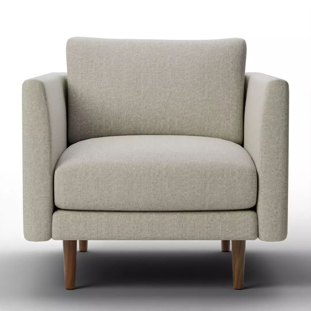 The Burrard Accent Chair (originally popularized by Article) is a masterclass in Mid-Century Modern (MCM) Boxy minimalism. For a 3D artist, it’s the perfect asset to ground a scene because its rigid, rectangular outer frame provides a sharp contrast to the soft, organic button-tufted cushions inside.
