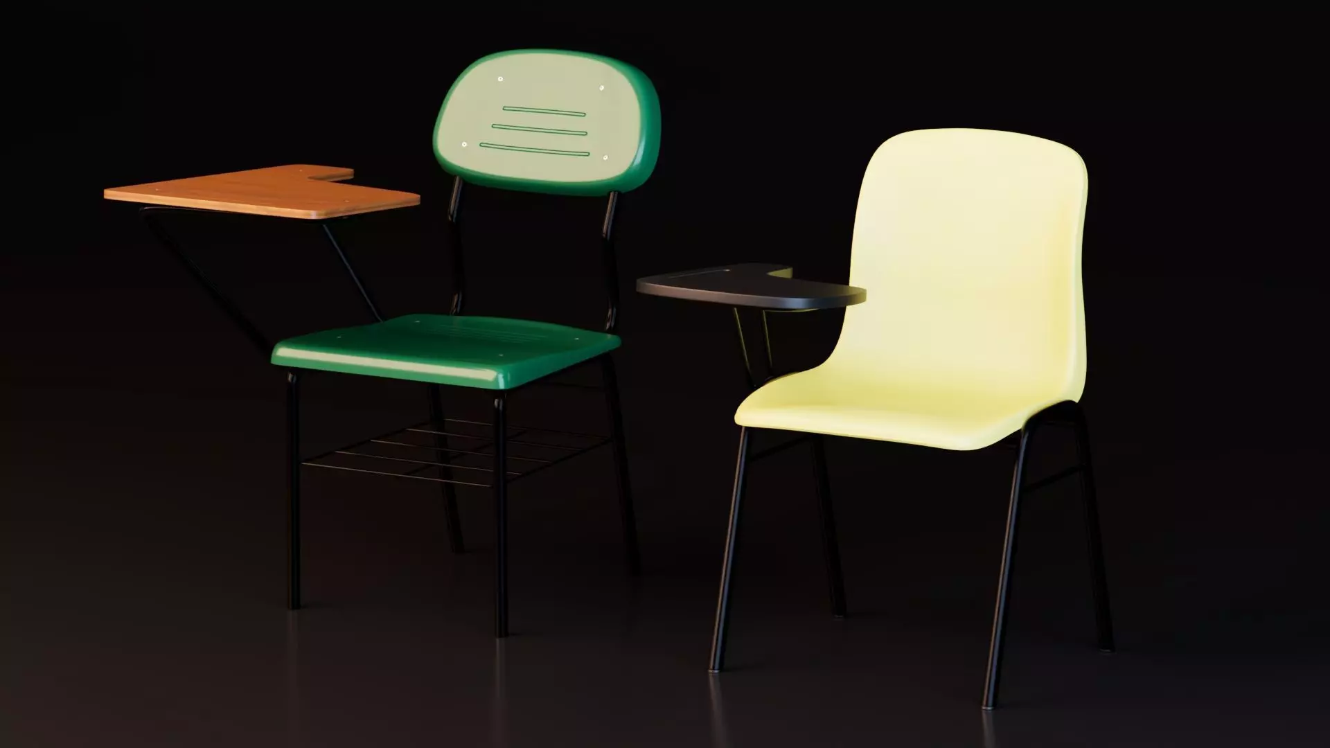 This Classroom Student Chair 3D Model Set features two realistic school furniture variations, each equipped with a study writing pad — perfect for educational environments, training room layouts, architectural visualization, and game scenes. The model includes a green steel-frame classroom chair with a wooden desk arm and a modern plastic student chair with a foldable writing pad, accurately designed for realism and practicality in any academic interior scene.