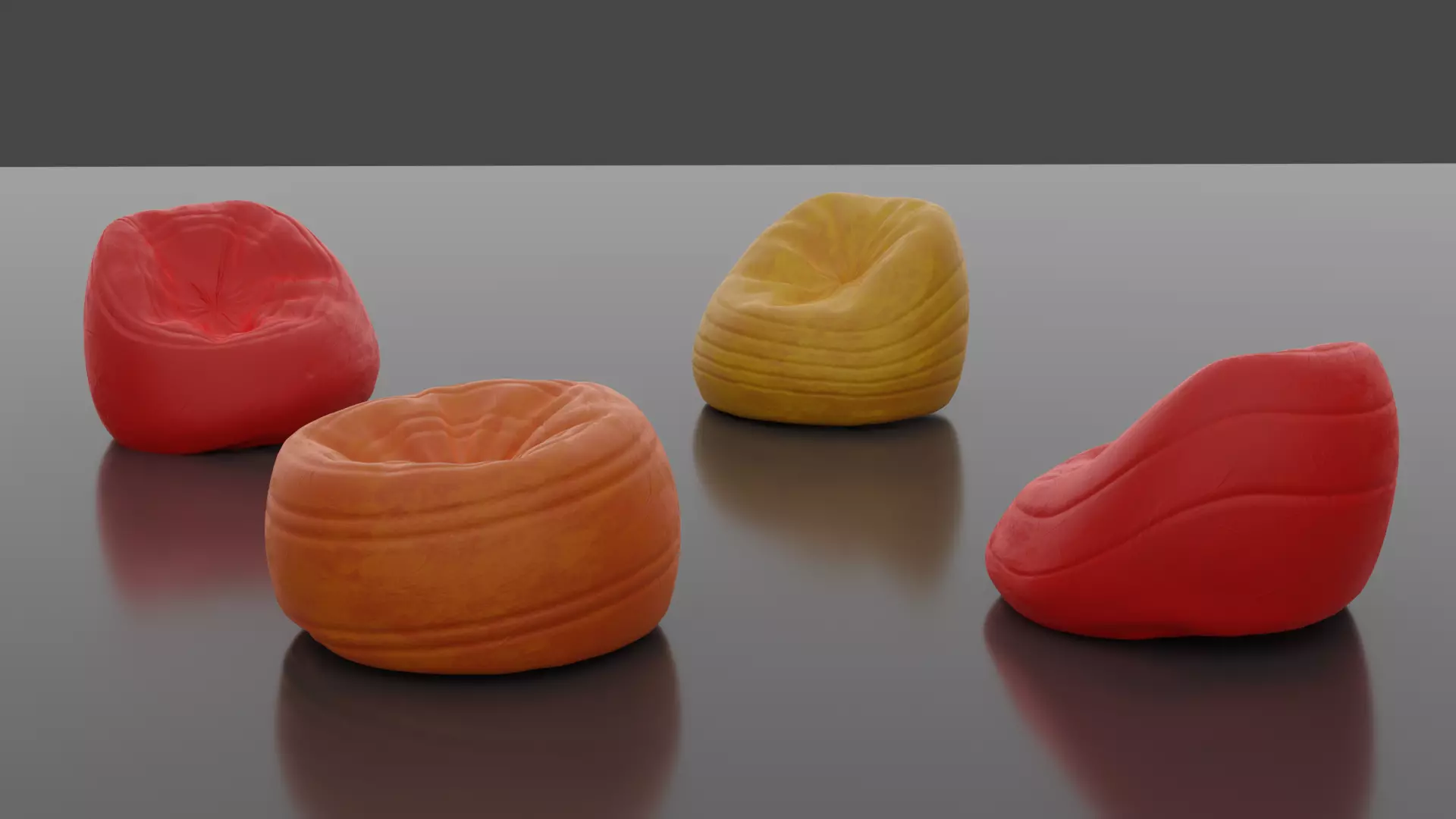 A colorful set of four bean bags, with various forms and deformations, they could be used in many architectural projects, interior design spaces and also outdoors and recreational spaces, living rooms and kindergartens,