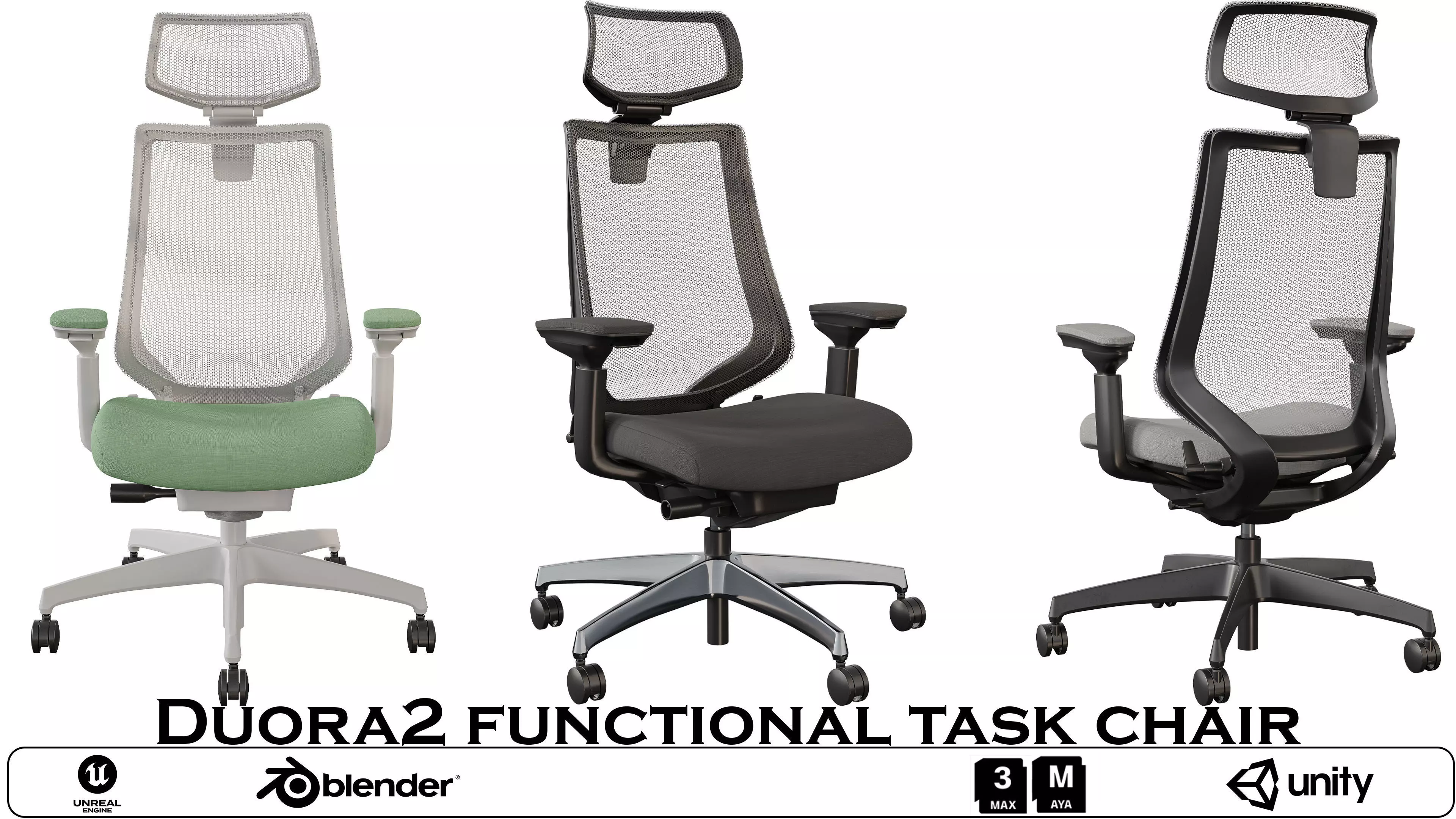 Name: Duora2 functional task chairType: modelFormat: 3Ds Max 2013Export: FBX, OBJRender: VRay (5.x), Corona (9)Polys: 68516Verts: 67198Matclasses: Multimaterial,VRayMtl,_CoronaPhysicalMtlUnits: CentimetersDimension: 94.78 x 74.02 x 118.57Date: 2025.10.7Boost your virtual workspace with the Duora2 Functional Task Chair, a high-performance ergonomic 3D model designed for comfort and realism. This chair features a breathable mesh backrest, adjustable headrest, cushioned seat, and armrests—all supported by a five-wheel base for smooth mobility. The model includes multiple views (front, side, rear) and color variations, including green and black seat options, to suit a range of interior styles.