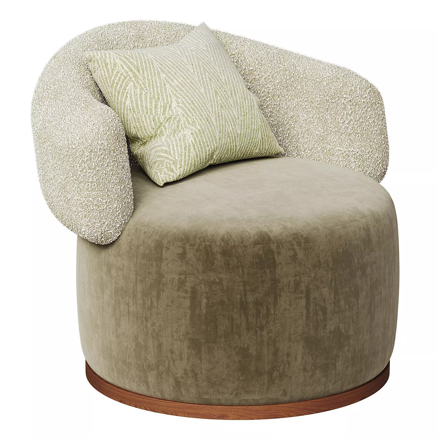 The combination of the smooth fabric seat and the textured boucle backrest creates a unique aesthetic that enhances any modern interior. The sturdy cylindrical base ensures stability while adding to the armchair’s elegant design. Perfect for living rooms, bedrooms, or cozy reading nooks, the Elise armchair provides a comfortable and chic seating option.