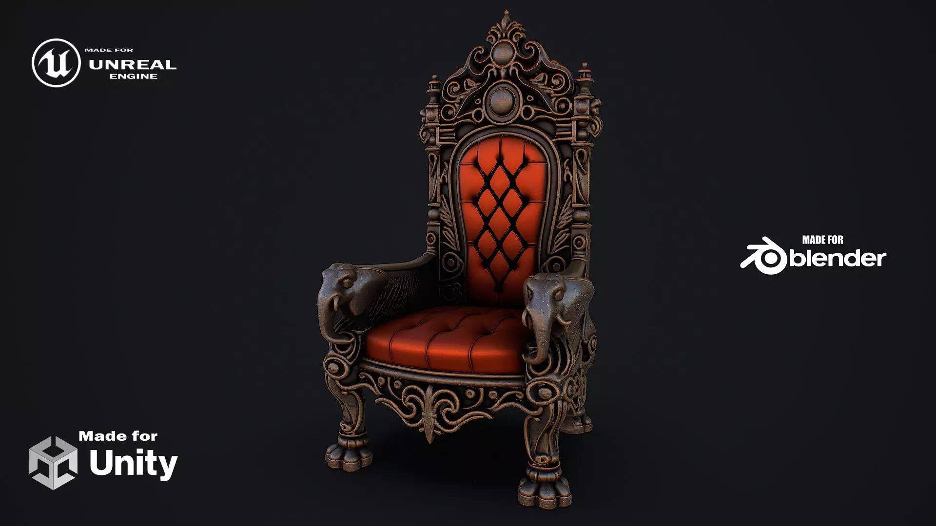 Hello. This is a high definition quality polygon of a Fantasy Throne 11 3D Model with PBR textures. Extremely detailed and realistic. Suitable for movie prop, architectural visualizations, advertising renders, games, VR, AR and other. The archive includes Obj and FBX, Marmoset scene, Blender scene, textures for the PBR: Base color, Metallic, Mixed AO, Normal_OpenGL, Roughness. And also included in the archive textures for UE: BaseColor, Normal, OcclusionRoughnessMetallic. All textures are 4k resolution. The model contains 1 object: Fantasy_Throne_11.