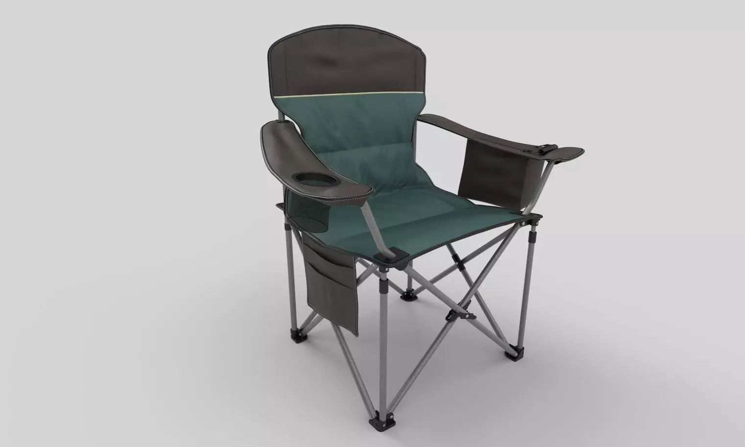 This is a high-quality 3D model of a foldable camping chair designed for outdoor activities, picnics, and events. The chair features a durable fabric seat and backrest with reinforced stitching, a sturdy foldable metal frame, and convenient accessories including a built-in cup holder on the armrest and side storage pockets for essentials.