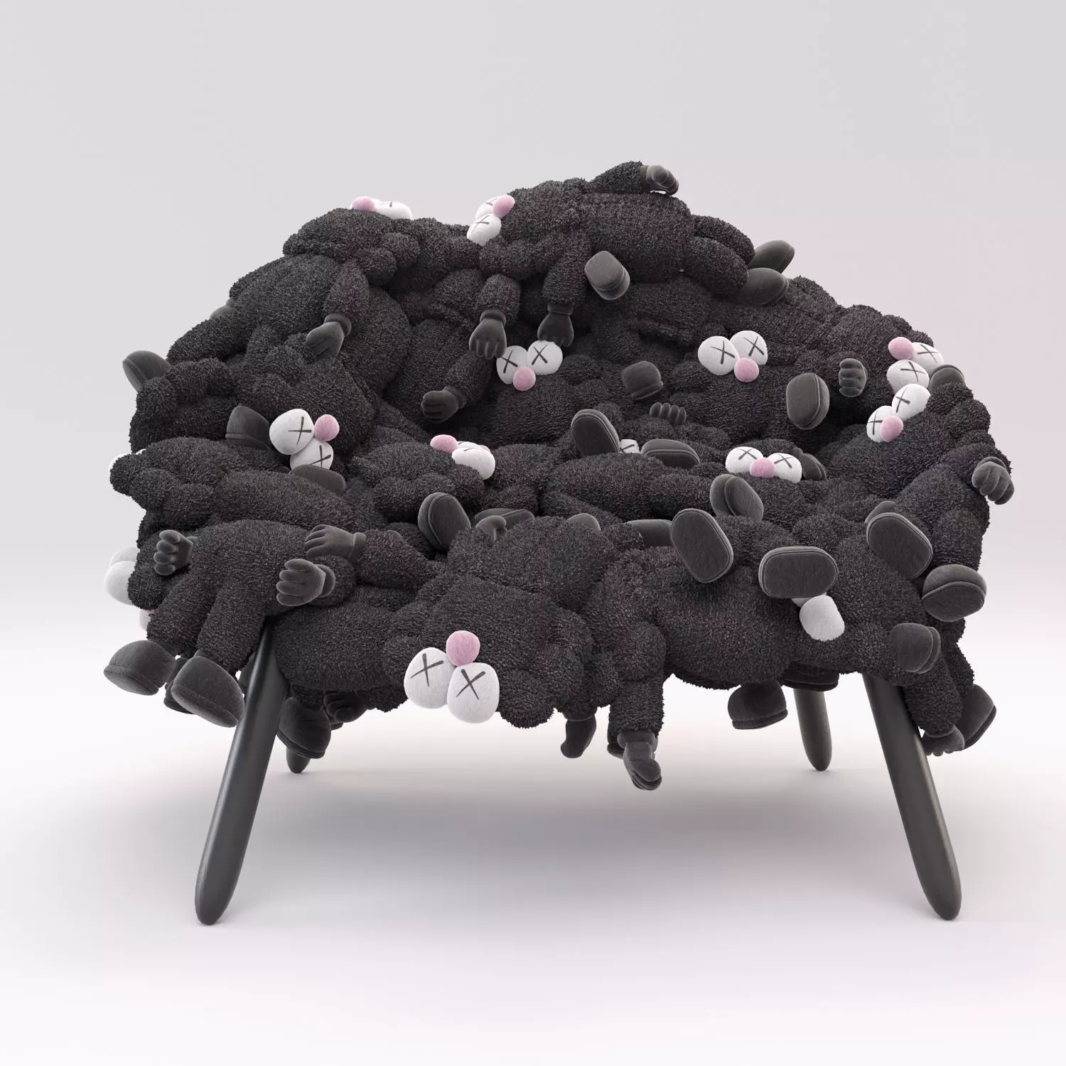 KAWS CHAIR BLACK is the brainchild of KAWS and the São Paulo design duo Humberto and Fernando Campana – also known as the Campana brothers. Inspired by the spirit of Brazilian street life, they are renowned for using unexpected combinations of everyday materials that appear ordinary to make extraordinary furniture. Armchair with seat and back made from KAWS’s instantly recognizable character BFF in black. The present work incorporates 75 to 120 of these black characters, all of which have been carefully stitched together in a seemingly random fashion.