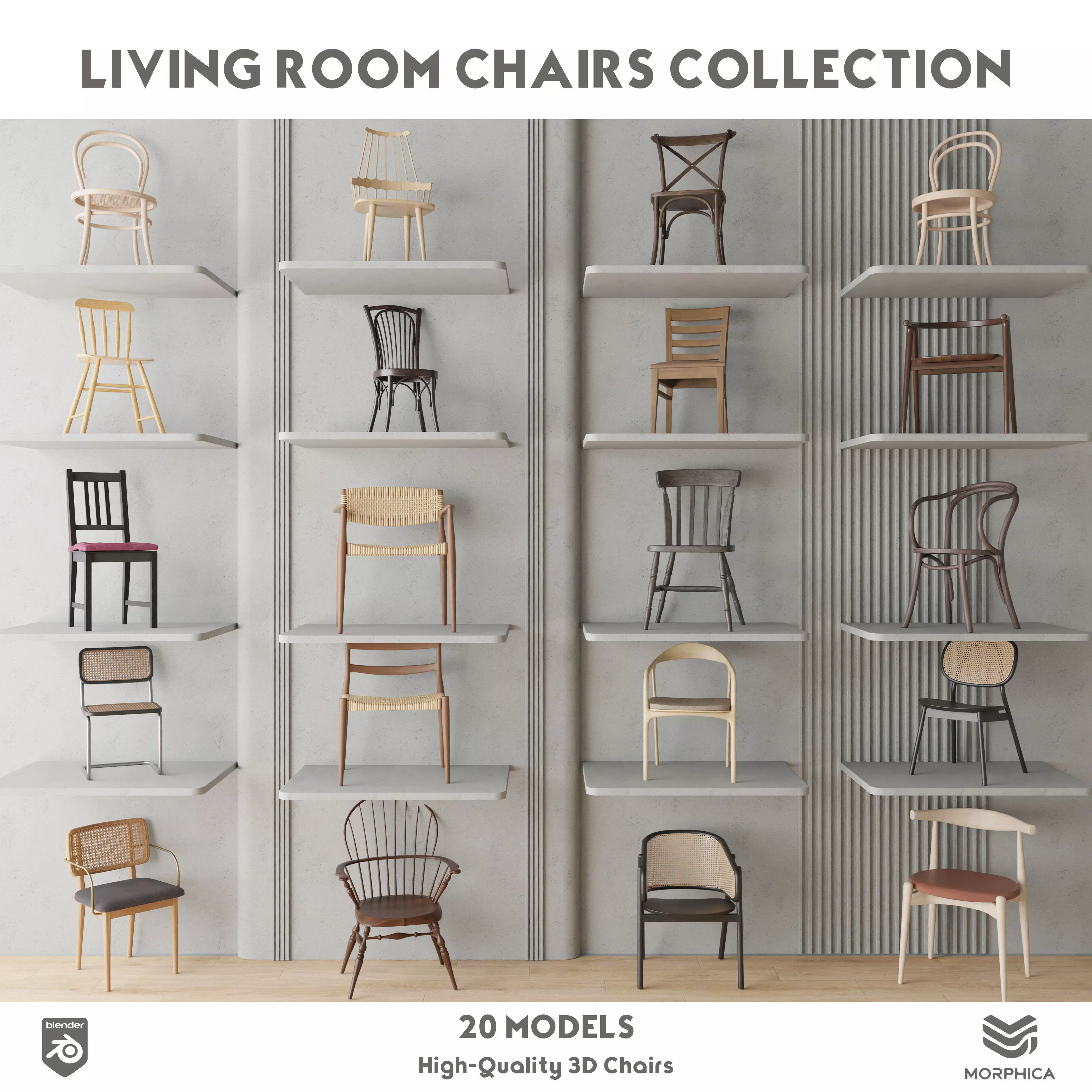 This collection includes 20 high-quality modern chair models, created and optimized for Blender.All models are fully textured, cleanly modeled, and ready to use – just open the .blend file and start rendering.