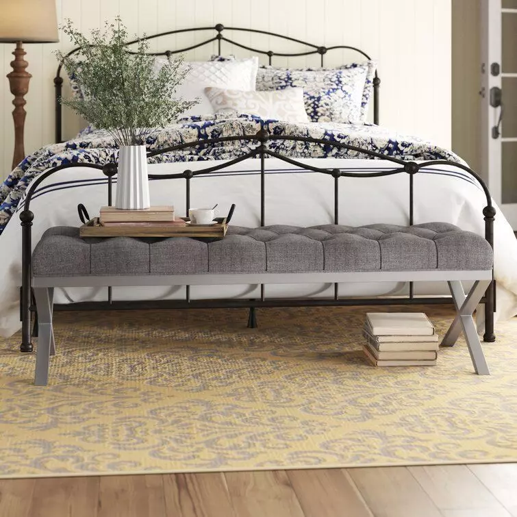 • Fancy clean-lined tufted Loden Upholstered Bench in gray fabric upholstery and brushed stainless steel legs in a crossed pattern is fashioned to make a statement in any home. It is functional and long enough to fit a few guests while entertaining in your home. It can be used in multiple parts of the home and can serve both functional and decorative purposes