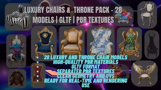 28 luxury and throne chair modelsHigh-quality PBR materialsglTF formatSeparated PBR texturesClean geometry and UVsReady for real-time and rendering use