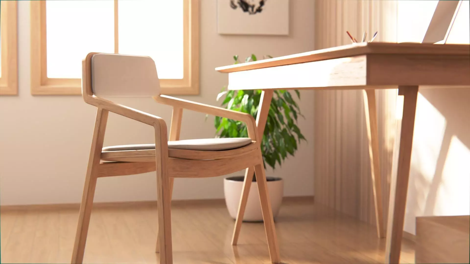 A minimalist wooden armchair in cohesive Japandi style — upholstered seat and back,tapered oak frame, mid-poly geometry with modeled chamfers. Multi-format, render-ready.