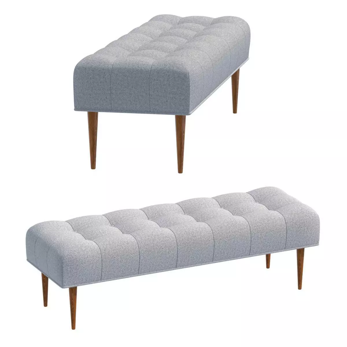 Modern Button Tufted Bench Upholstered in Pale Grey with Walnut Spindle LegsMade to be both durable and responsible, this bench is handmade with a hardwood frame of FSC certified poplar, corner blocks of reclaimed oak, webbing suspension of renewable jute, and premium high density foam cushioning for years of comfort. Shown here in Maharam’s Divina Melange #120, this bench can also be built in a vibrant palette of colors. All fabrics are traditional 100% wool upholstery felt and swatches are available by request.