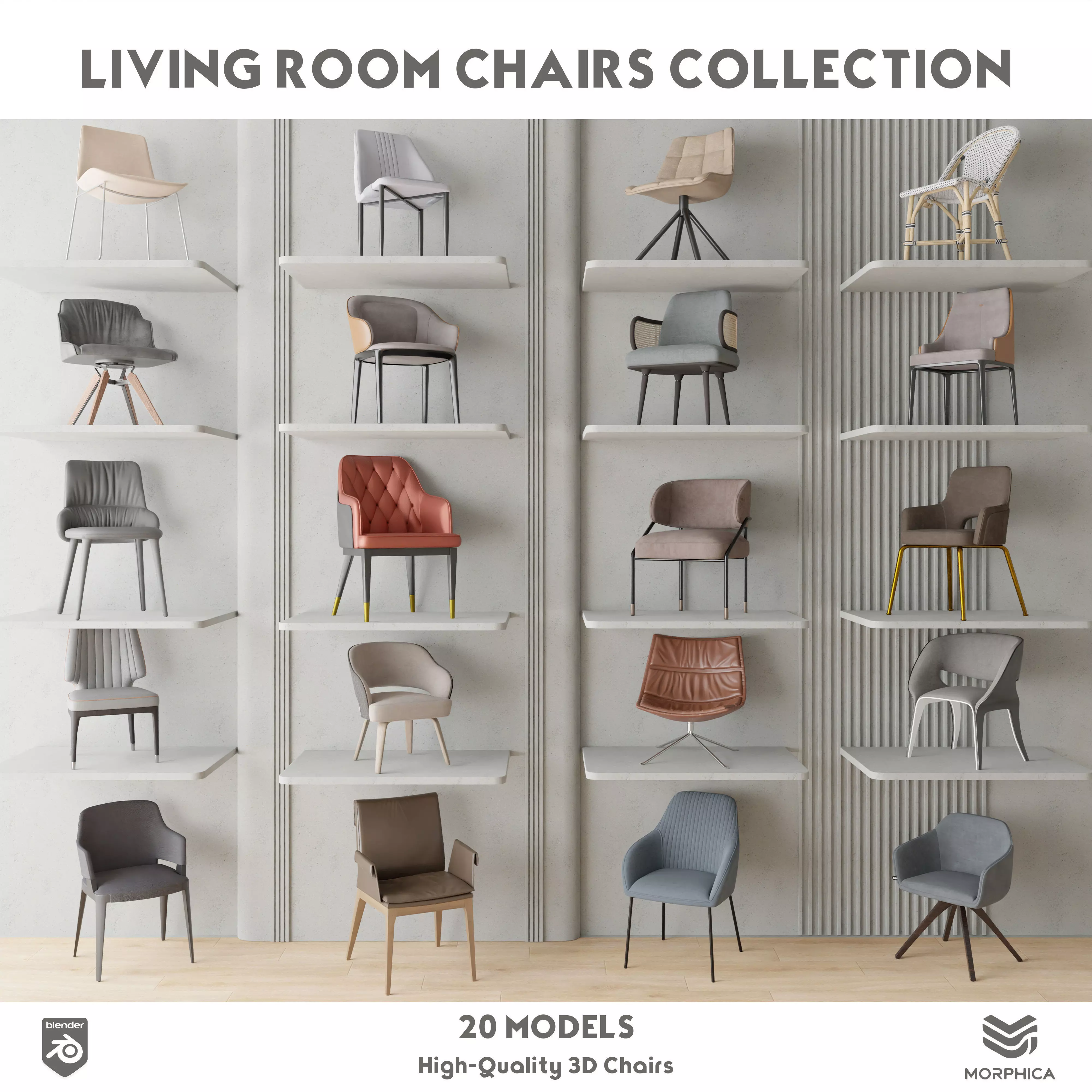 This collection includes 20 high-quality modern chair models, created and optimized for Blender.All models are fully textured, cleanly modeled, and ready to use – just open the .blend file and start rendering.