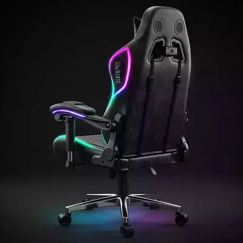 This 8K ultra-high-definition rendering showcases a modern high-end gaming chair featuring luxurious black leather upholstery and a racing-style bucket seat with vibrant contrasting stitching. Ergonomically engineered for peak comfort, it includes a lumbar support cushion, adjustable armrests with integrated RGB LED lighting, and a glowing control panel. The chair’s base boasts a colourful neon underglow, polished chrome support, smooth-rolling casters, and a pneumatic height adjustment system. Built-in speakers in the headrest enhance the immersive experience. Photorealistic materials, realistic wear patterns, and dramatic studio lighting highlight the chair’s premium design and cutting-edge appeal.