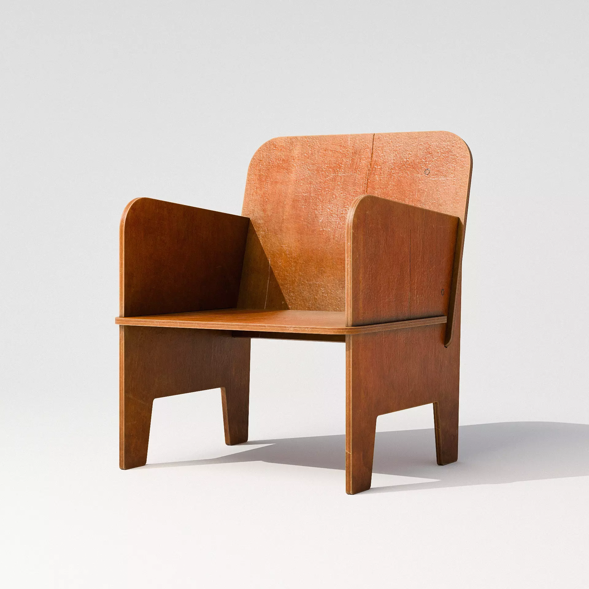 Modernist Plywood Chair is a faithful 3D reproduction of a rare Dutch design from the 1930s, embodying early modernist principles through simplicity, function, and material honesty. Constructed entirely from bent and cut plywood, this chair features bold planar surfaces with softened corners and exposed joinery that celebrate its construction. The rich reddish-brown finish is paired with visible grain patterns, light scuffing, and patina that evoke the piece’s vintage origins. Ideal for mid-century interiors, museum scenes, or minimalist visualizations, this chair adds architectural character and historical depth to any 3D environment.