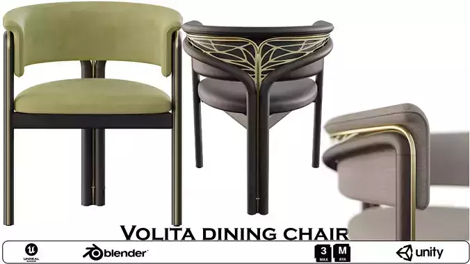 Name: MORPHO Volita dining chairType: modelFormat: 3Ds Max 2013Export: FBX, OBJRender: VRay (5.x), Corona (9)Polys: 24481Verts: 25058Matclasses: Multimaterial,VRayMtl,_CoronaPhysicalMtlUnits: CentimetersDimension: 88.26 x 54.85 x 70.0Date: 2025.10.1Infuse your digital interiors with elegance and artistry using the Volita Dining Chair 3D model. This premium asset features a refined silhouette with a cushioned seat and backrest, available in green and gray fabric options. The front view showcases a sleek dark wooden frame with metallic cylindrical legs, while the rear view reveals a stunning leaf-like golden pattern that adds a luxurious and decorative touch.