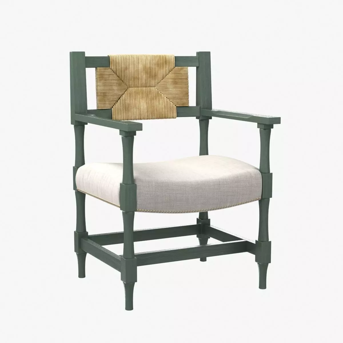 New York Athletic Club Armchair with upholstered seat and natural rush back. Made to order with client's own material. Available in the following standard finish options: Light Walnut, Dark Walnut, Cerused, Painted White, Ebonized, and Standard Green Painted (shown).
