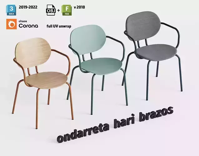 This is a render-ready 3D model of 'Hari con Brazos' chair by Spanish design bureau Ondarreta. Full UV unwrap. Clean mesh. All materials and texture maps included. Low poly count by 2025 standards. Optimized geometry. FBX and OBJ included. No additional work required to render. Optimized for 3DsMax and Corona Renderer 9.