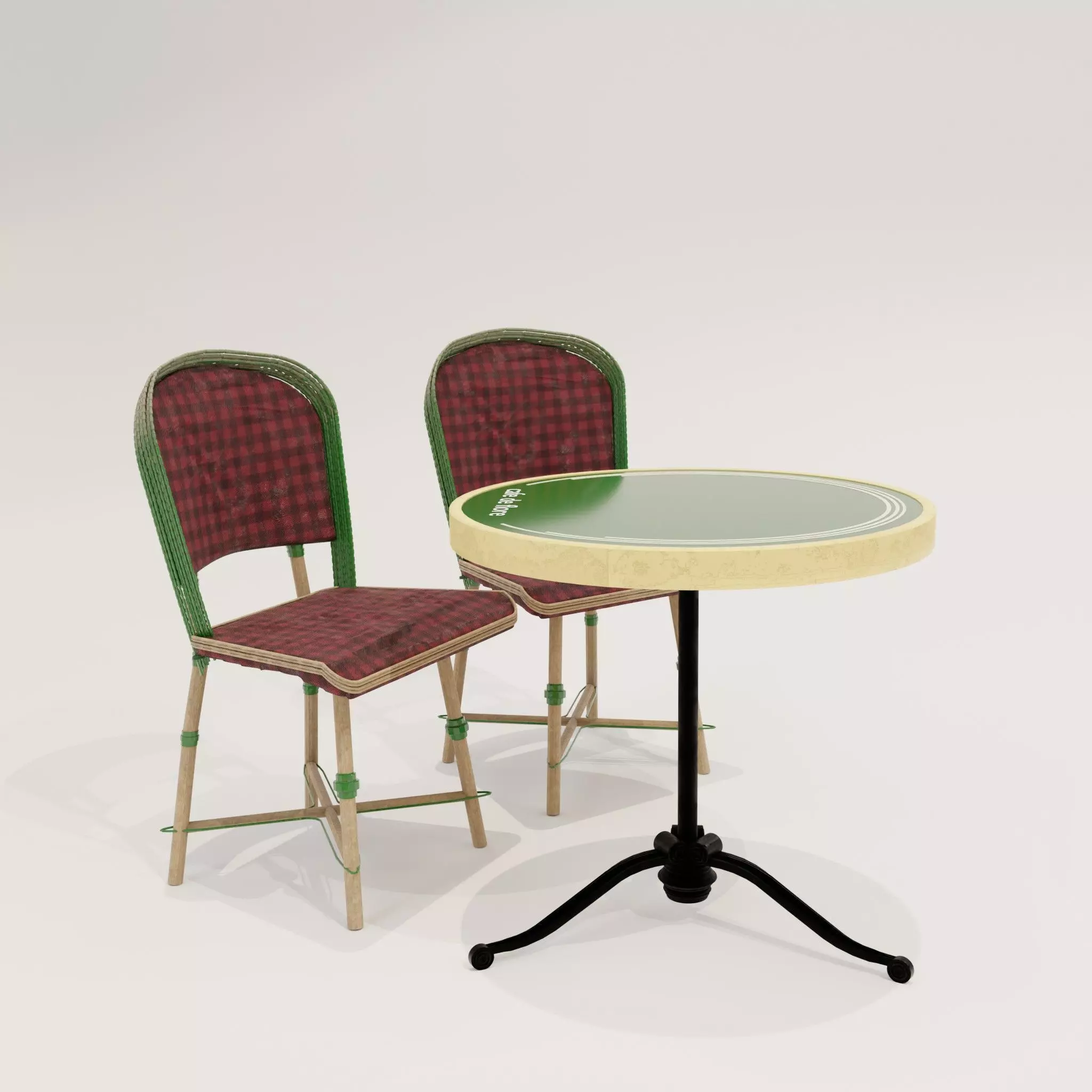model info (dimensions)length:1.4 mwidth:1.6 mheight:1 mcolors:red &green & gold & blackmaterials:wood & fabric & plasticparis cafe de flore table and chairshas full uv and unwraping.