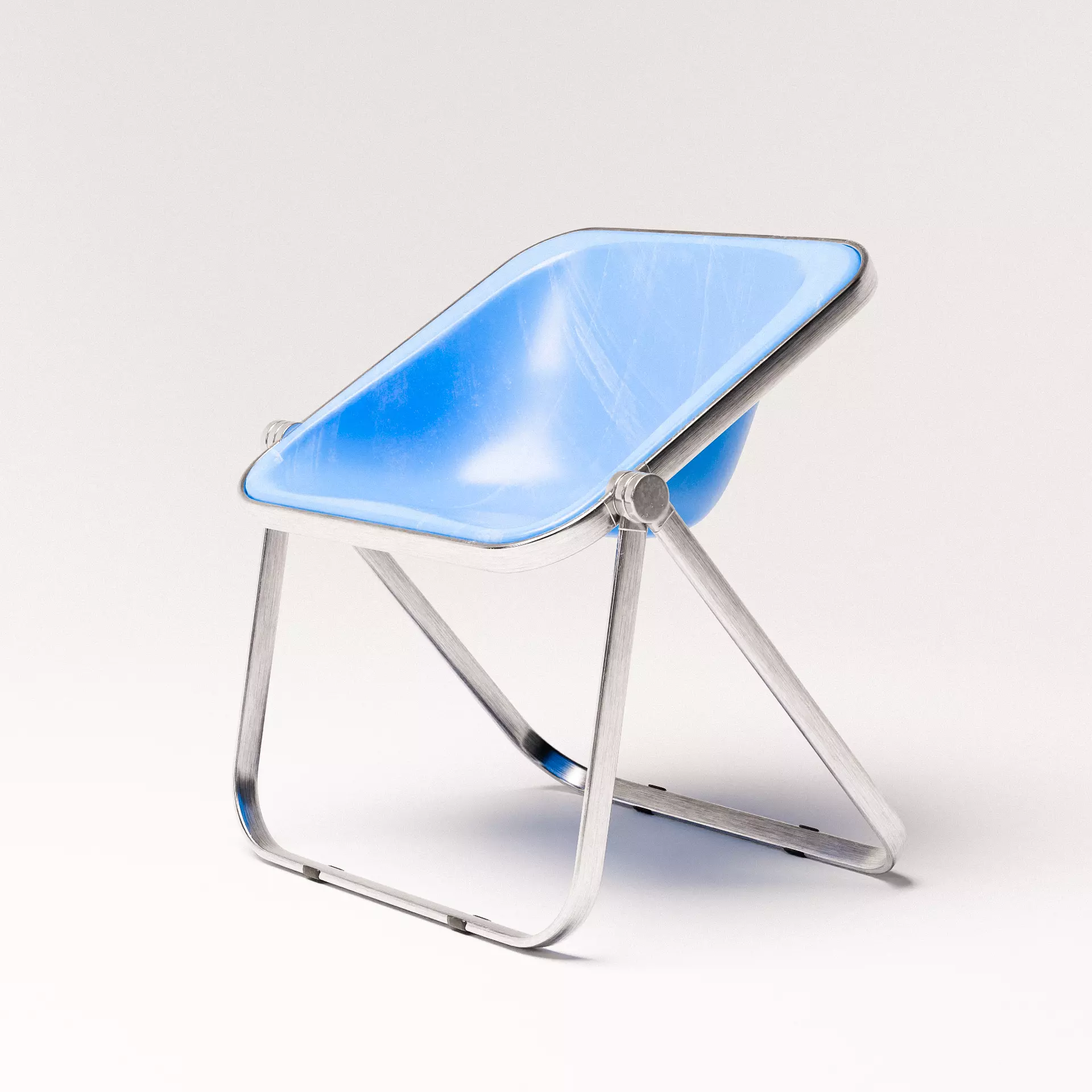 An iconic Plona Folding Chair designed in 1970 by Giancarlo Piretti. Thanks to its unique design, it combines aesthetics, functionality, and comfort. The solid tubular structure is in polished stainless aluminum alloy, with hinges in die-cast light alloy.