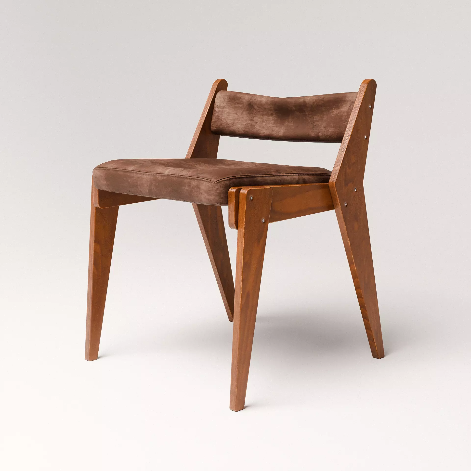 The chair features a simple, elegant design with a wooden frame and angled legs. The seat and backrest are upholstered in soft, rich brown fabric that complements the natural wood tones. The clean lines and minimalistic structure evoke a sense of mid-century modern style, with a focus on functional design and comfort. The exposed screws on the sides give it a slightly industrial, yet refined look.