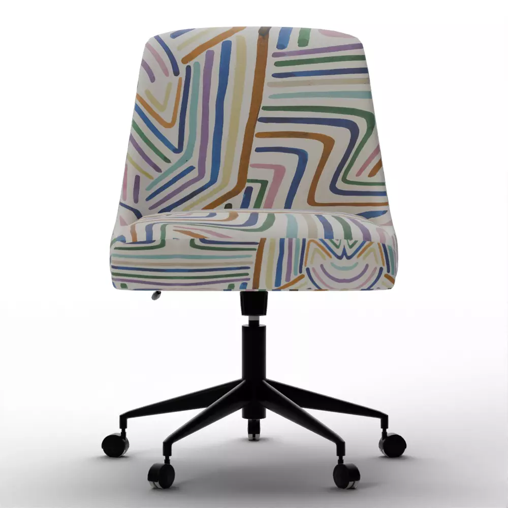 Inject a burst of artistic energy into your 3D workspaces with the Roey Desk Office Chair. This high-fidelity model features the vibrant Rainbow Strokes upholstery in Ochre Multi—a playful, painterly pattern of hand-drawn lines in terracotta, ochre, slate, and blush. The chair balances a mid-century Scoop silhouette with modern ergonomic functionality, featuring a 360-degree swivel and a sleek, five-star rolling base. This asset is the perfect personality piece for staging creative home offices, boutique studio environments, or modern student workspaces in 3D.