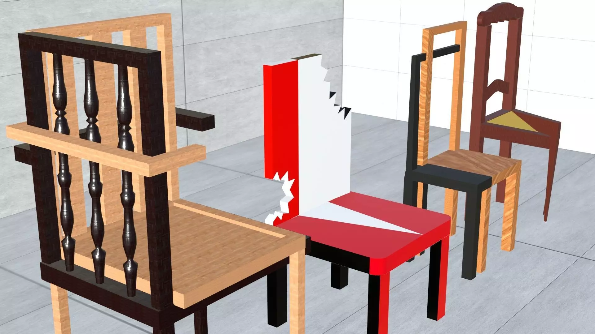 Add character and creativity to your scene with this uniquely designed Split Personality Chair. Inspired by abstract art and bold geometries, this model features an asymmetric backrest with a dynamic red-white-black color palette, making it a perfect fit for modern or surreal environments.