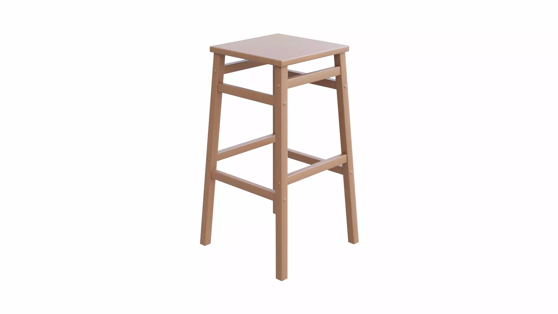 Square Wooden Stool 3D model that I made using Blender. The wooden materials on this model were made procedurally and then were baked to create PBR textures. The model has a seat at the top of the mesh, four legs, and 2 levels of supports. On either end of each support you will see wooden nail covers.