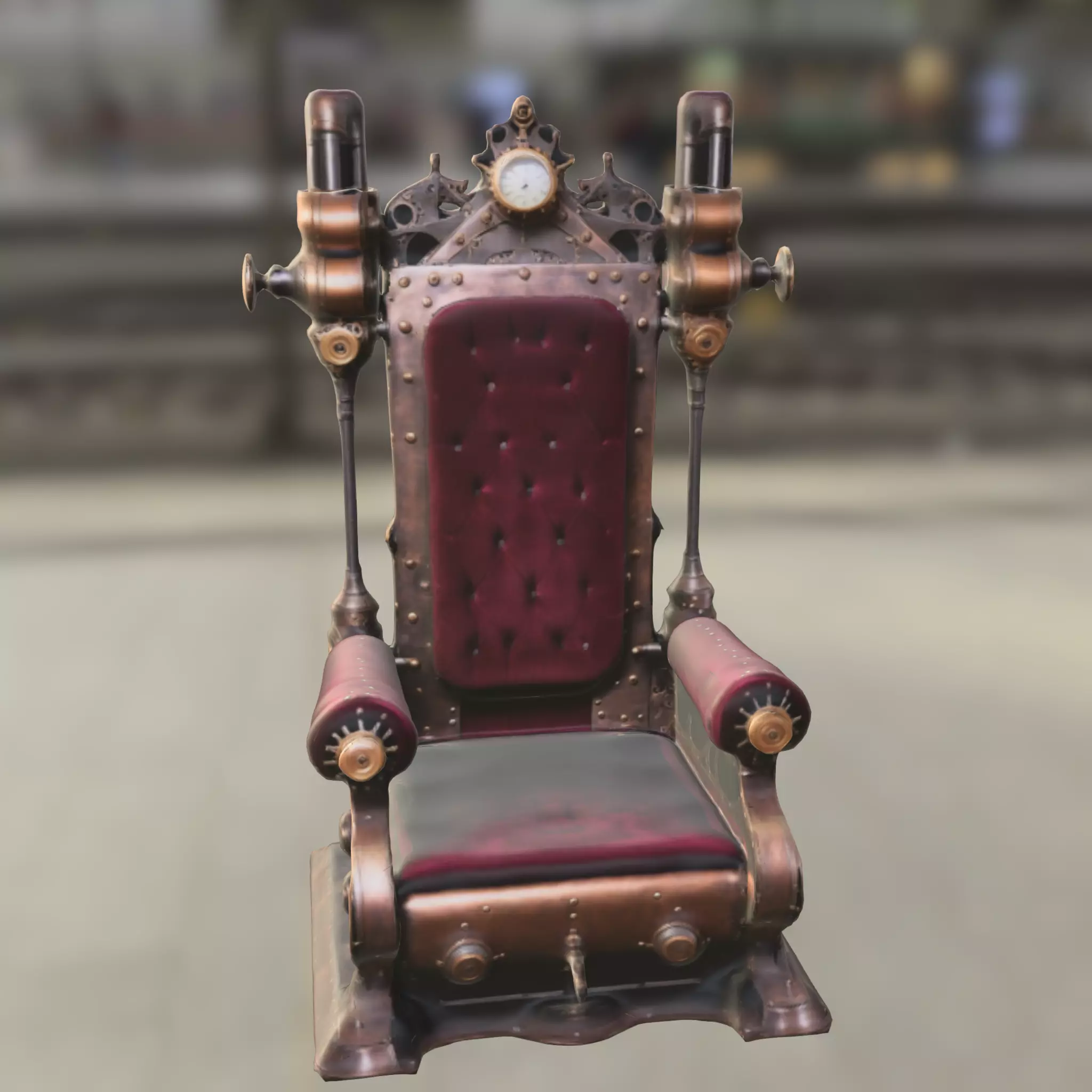 The Steam Throne is a detailed steampunk-style 3D model chair, featuring a blend of Victorian design and mechanical aesthetics. With leather-padded textures, riveted metal, pressure gauges, and pipe-like structures, this throne is ideal for games with alternate history or industrial fantasy themes.